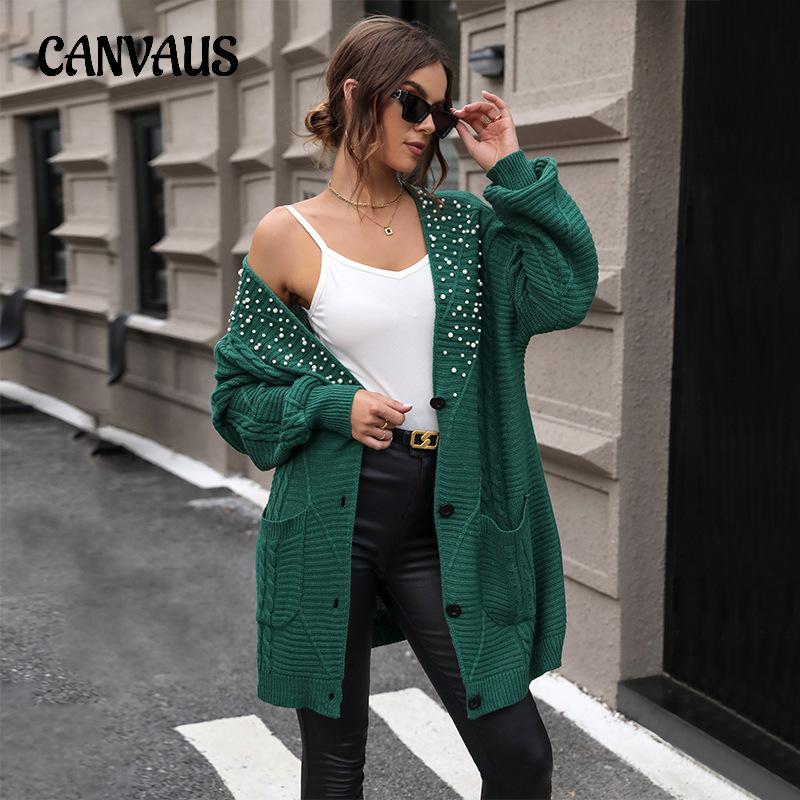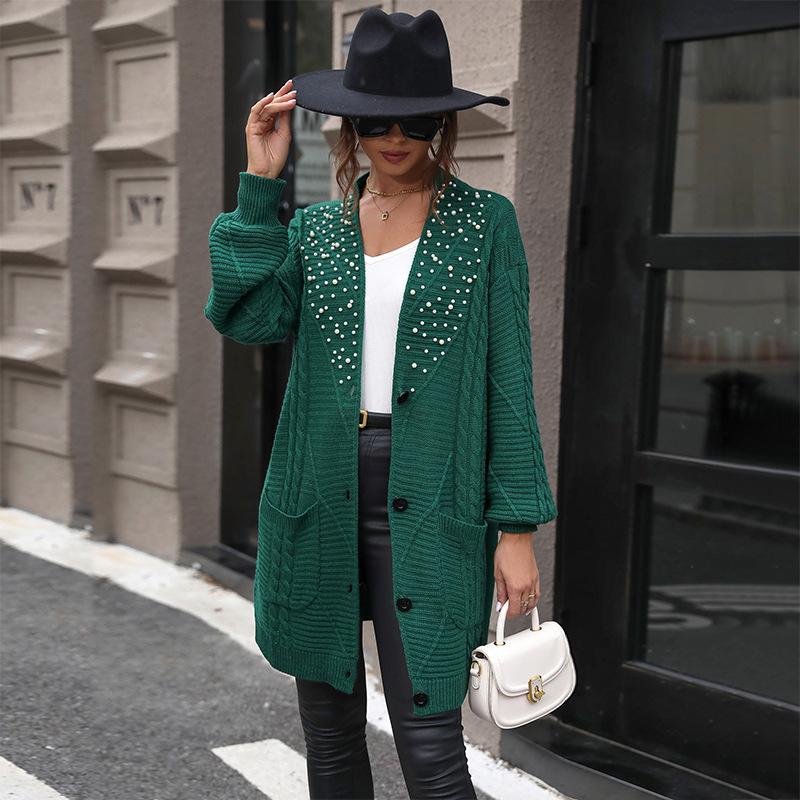 Осенне-зимний женский вязаный кардиган, текстурированная вязаная куртка, свитер средней длины, расшитый бисером, кардиган