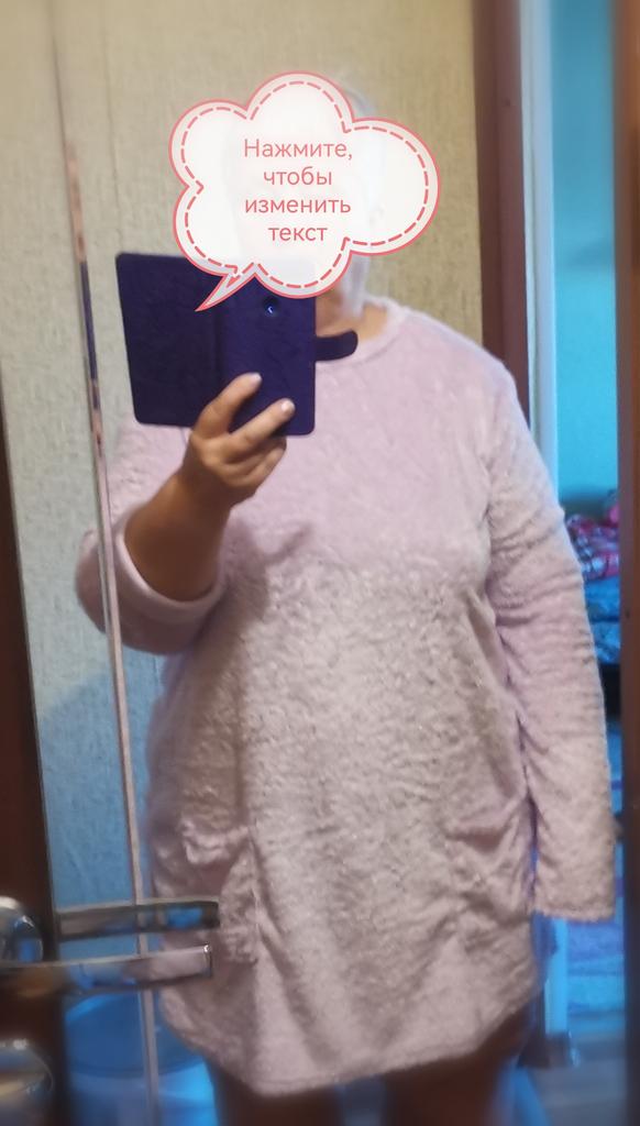 Огромный вырез, непонятно, зачем такой! Вещь не летняя, а видны голые плечи. Придется пододевать что-то с воротничком. Налеплены какие-то белые рисунки, которые не отодрать. А материал хороший, мягкий, очень теплый. У меня 52, но ХL великоват. Под пальто сгодится для согрева.