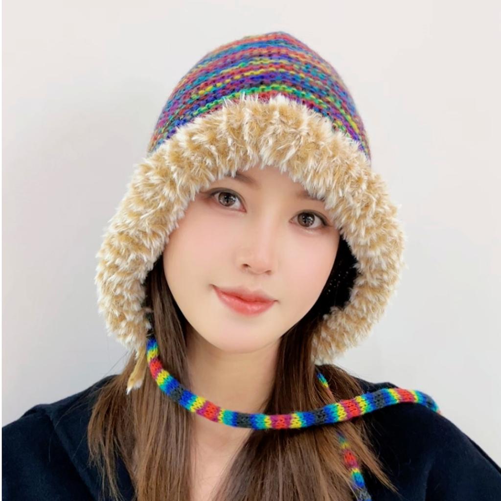 Осенне-зимняя кепка в радужную полоску, женская шерстяная шапка с защитой ушей, пуловер контрастного цвета на шнуровке, вязаная шапка