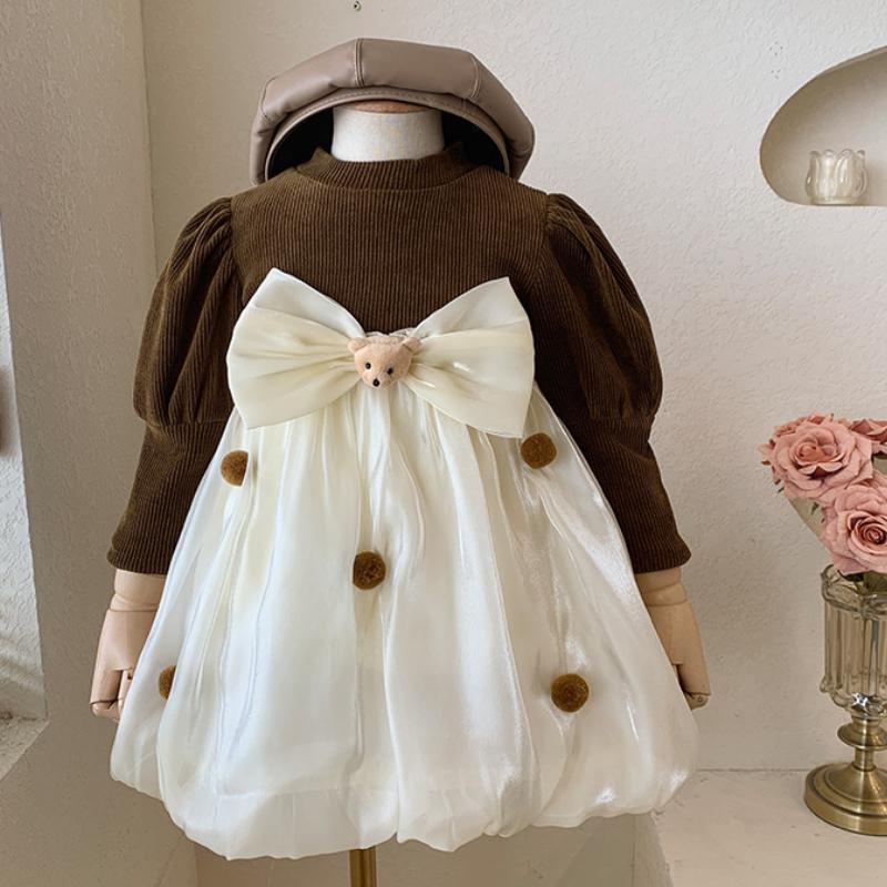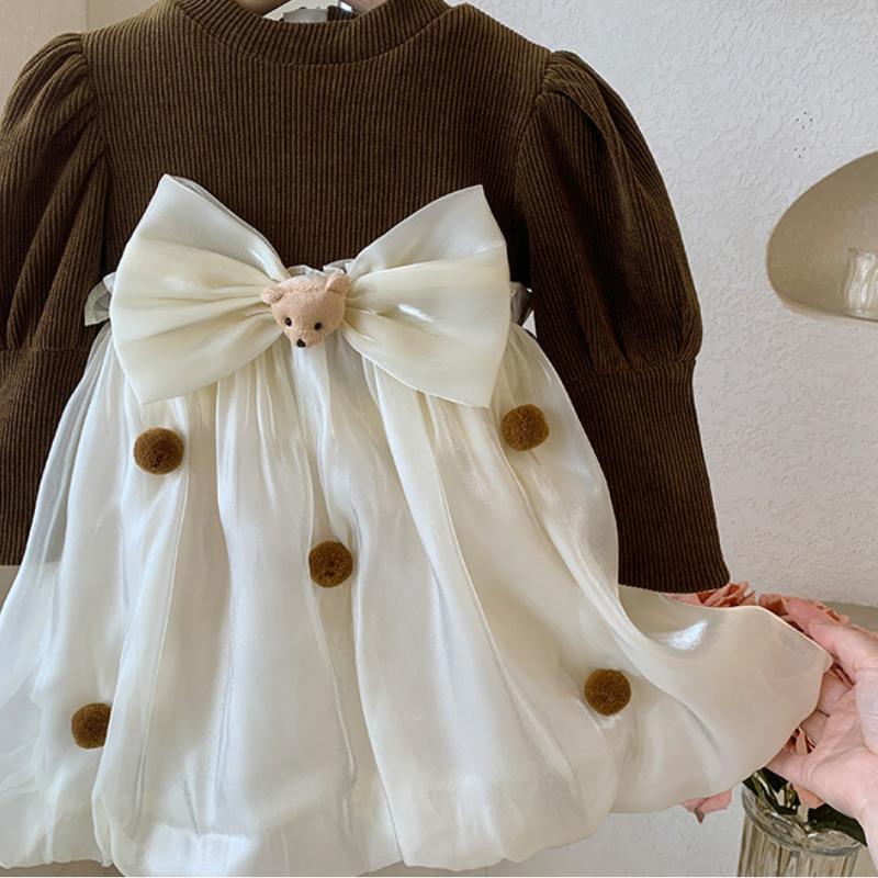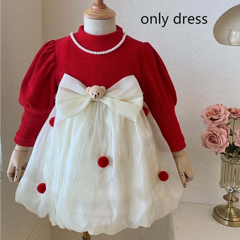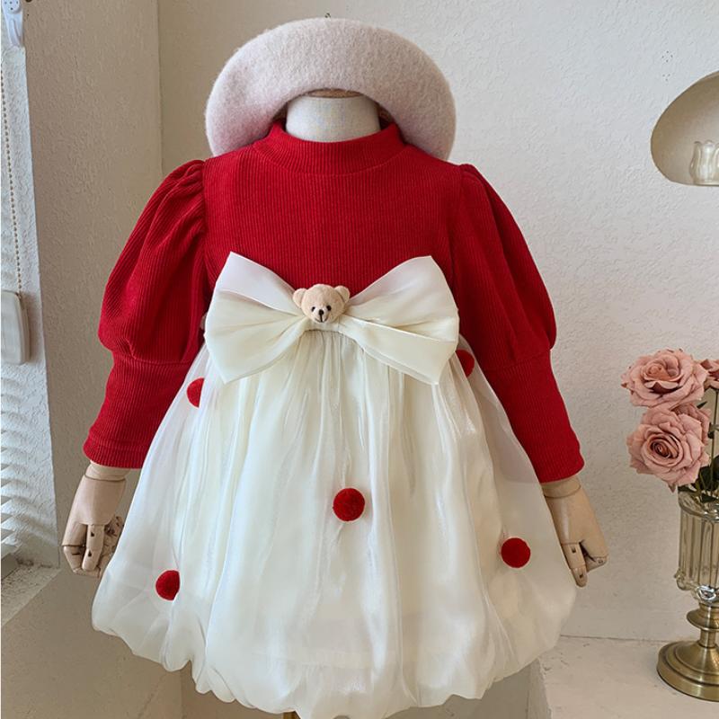 Платье с бантом для девочек, осенне-зимнее детское бархатное утепленное тюлевое платье с длинными рукавами из 2 предметов для маленьких детей, вязаные тюлевые платья для детей от 2 до 8 лет