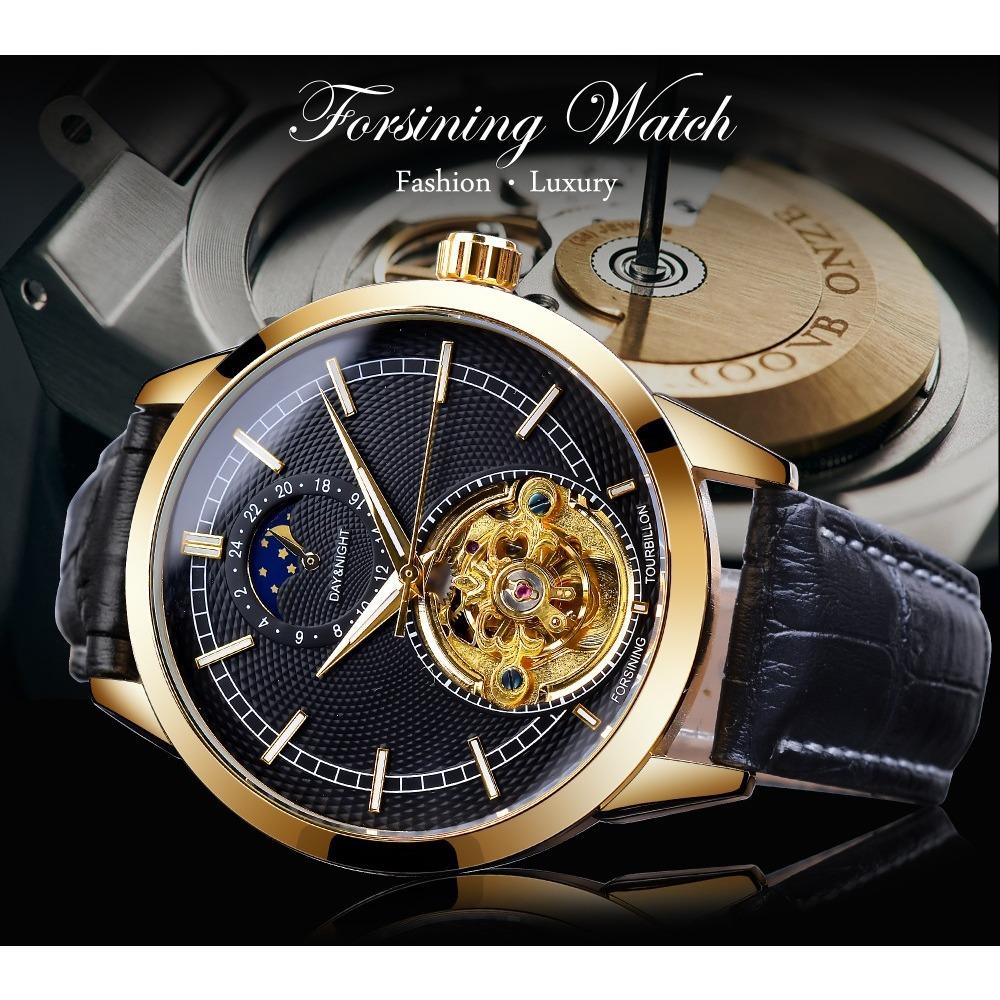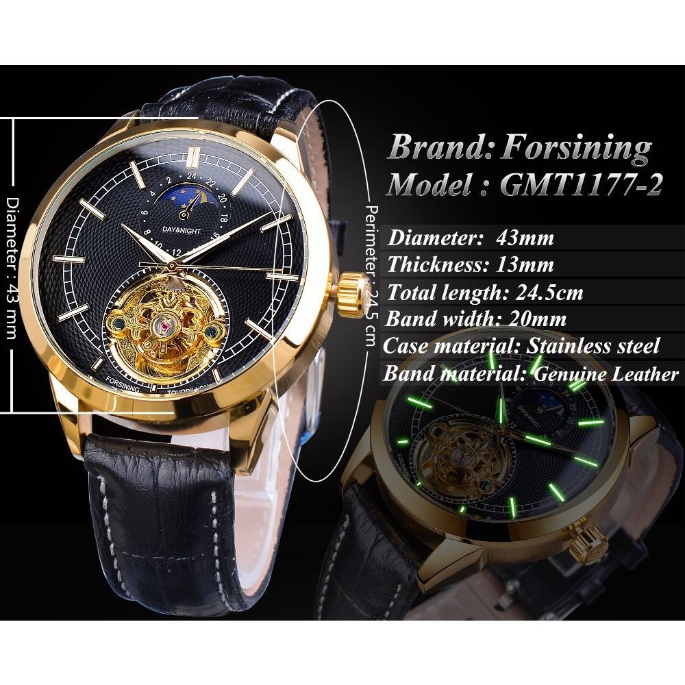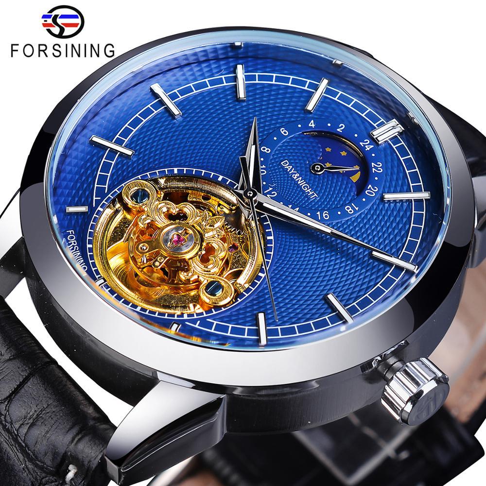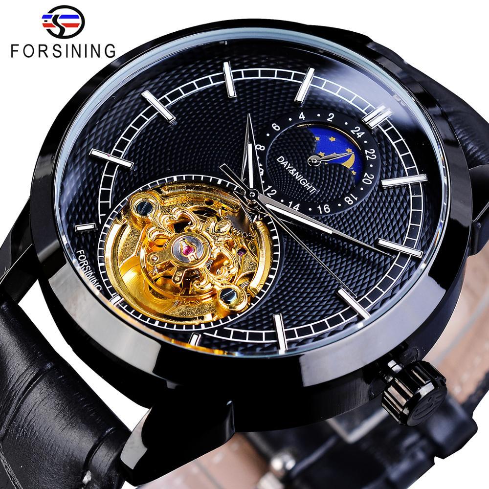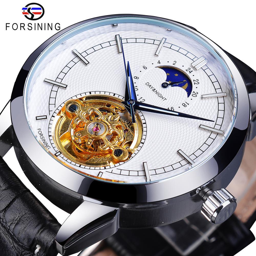 Forsining Мужские модные повседневные автоматические механические часы с полой фазой Луны и резными полыми GMT1177-2-A