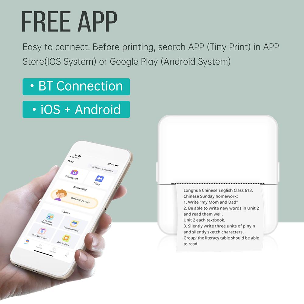 Способ подключения: Этот принтер поддерживает Wireless BT 4.0, что позволяет ему легко подключаться к вашему смартфону.. Чтобы использовать его, просто следуйте руководству пользователя и загрузите соответствующее приложение. (Крошечный принт) из магазина приложений (для систем IOS) или Гугл Плей (для систем Android).