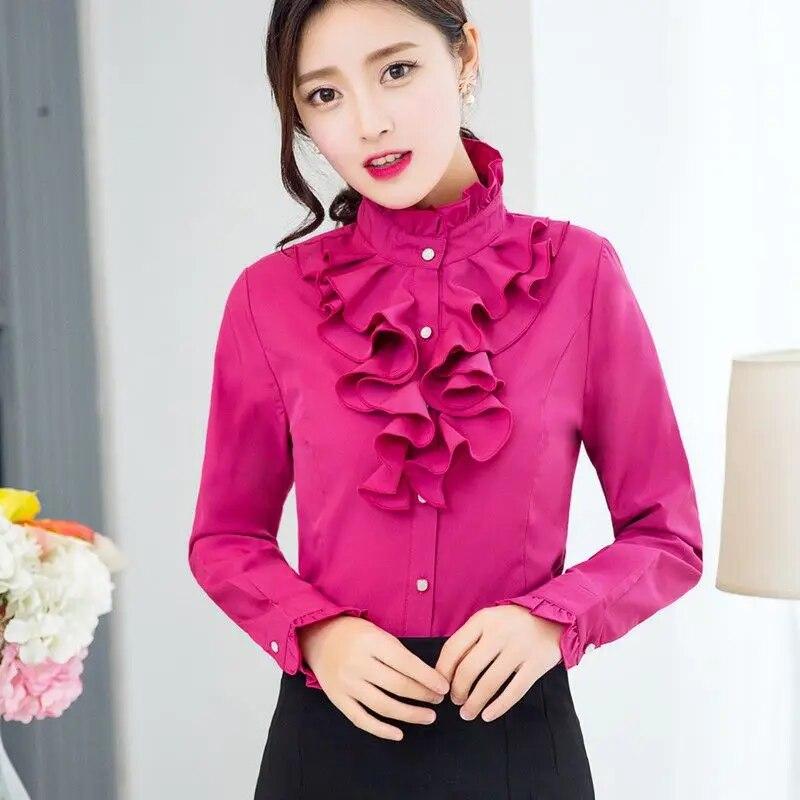 Весенне-осенняя новая блузка с воротником-стойкой и рюшами и длинными рукавами, женская корейская профессиональная спортивная рубашка, однотонная шифоновая рубашка