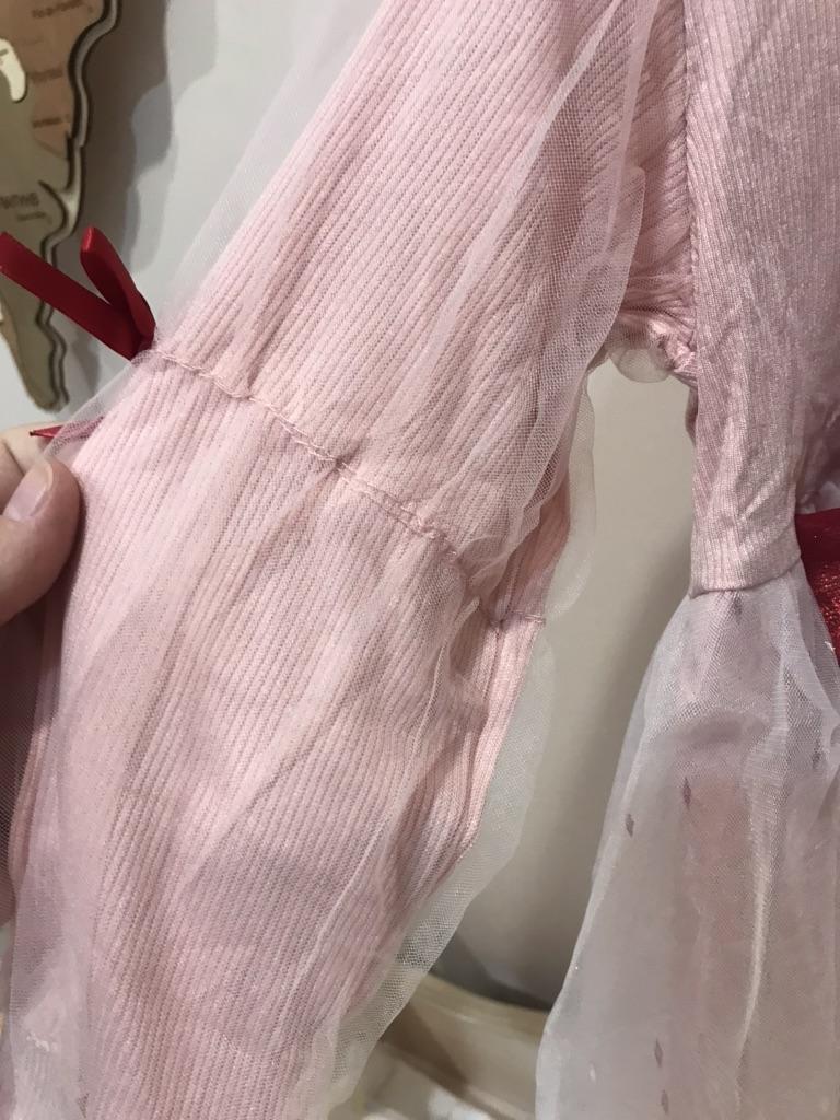 Швы на рукавах не ровные, и заметные. Качество материала хорошее, бант на удивление очень хорошего качества, приклеен горячим клеем, те что по меньше на рукавах зашиты не очень аккуратно, торчали нитки. Красивое платье, блестит.