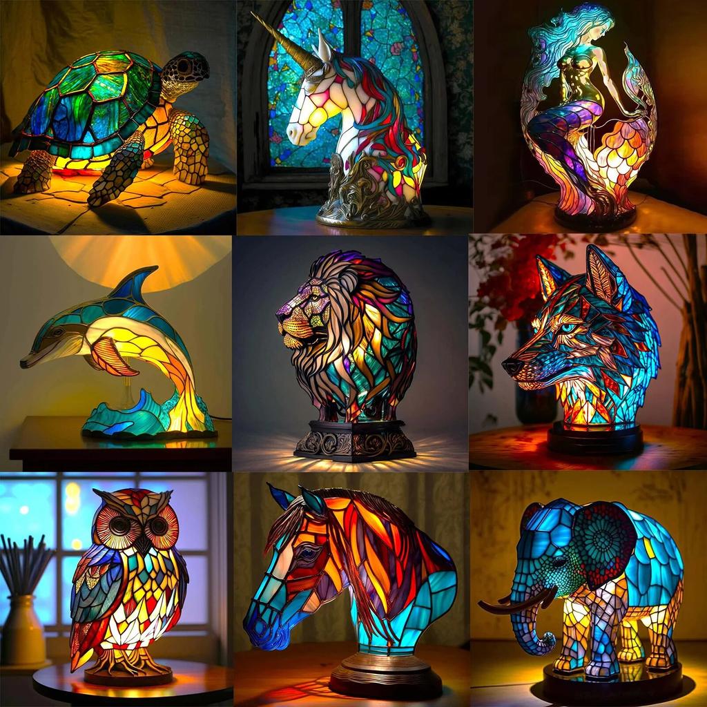 Настольная лампа с животными серии Лев Дельфин Волк Витражи Прикроватный светильник Сова Лошадь Петух Слон для гостиной Спальня Офис