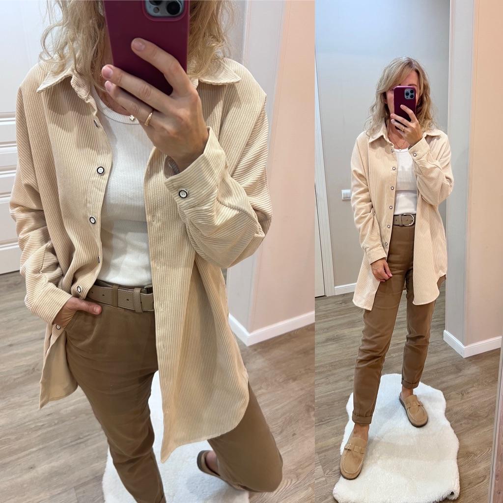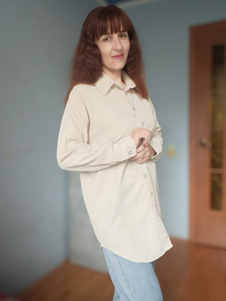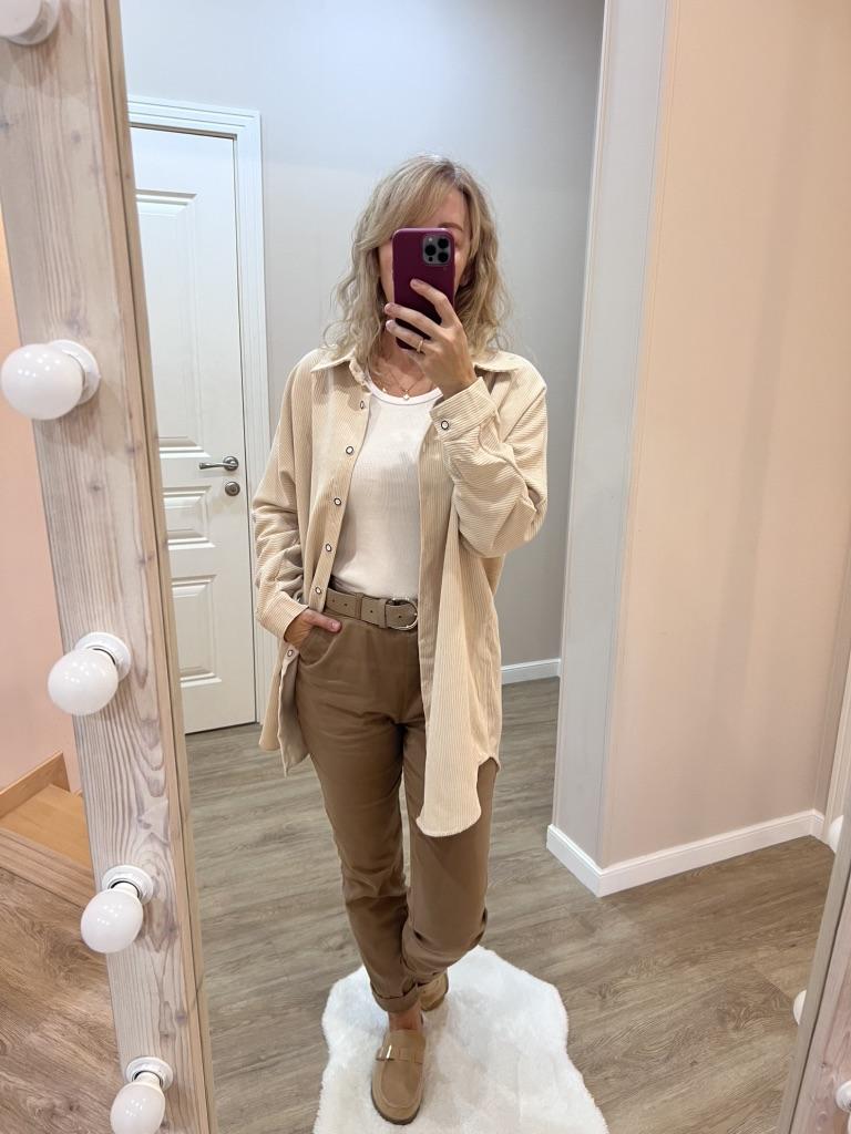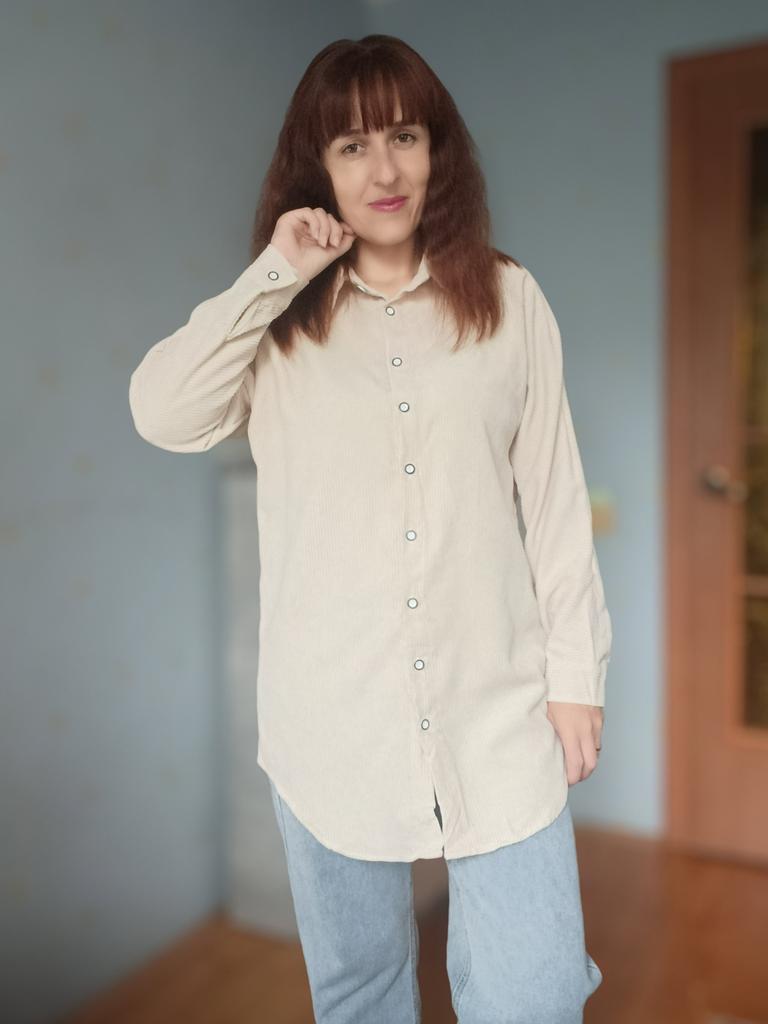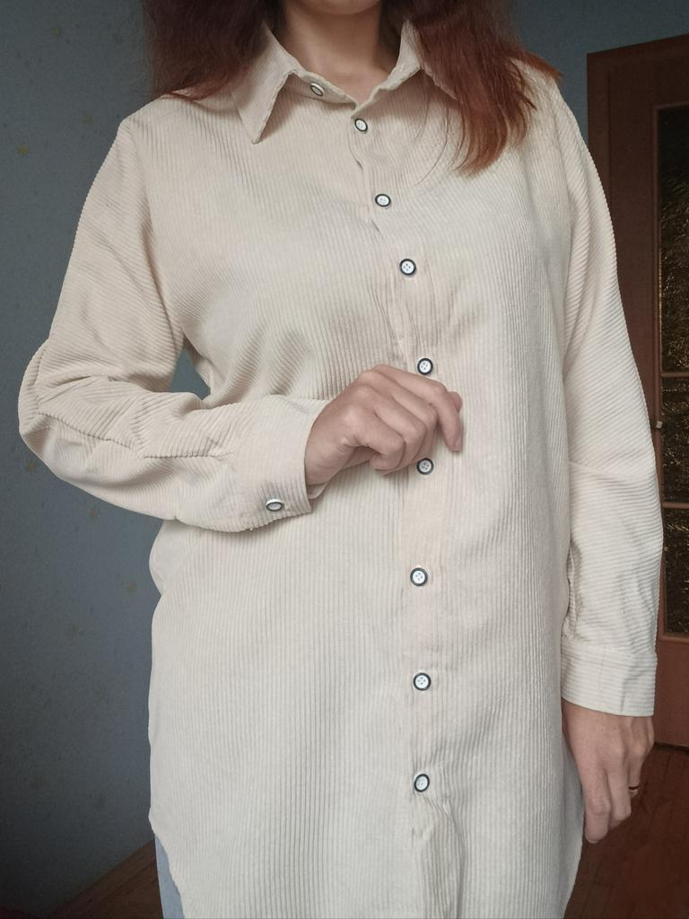Вельветовая рубашка.🔥 Суперская, даже прибавить нечего))) По ссылке только такой цвет и есть размерный ряд. На параметры 90-72-99, рост 169, взяла размер Л. Села отлично, чуть свободно. Так, как я и хотела. Рукава нормальной длины Изделие удлиненное. Низ полукругом. Застежка- пуговички. Ткань- 85%хлопка, если судить по по описанию, так как этикеток нет. Думаю, так и есть. Материал не тонкий, ощутимый. Мнется не сильно, гладится легко. Можно носить как самостоятельную вещь или вторым слоем. Мне все понравилось. Цвет базовый- оттенок бежевого. Советую. Огонь, рубашка!