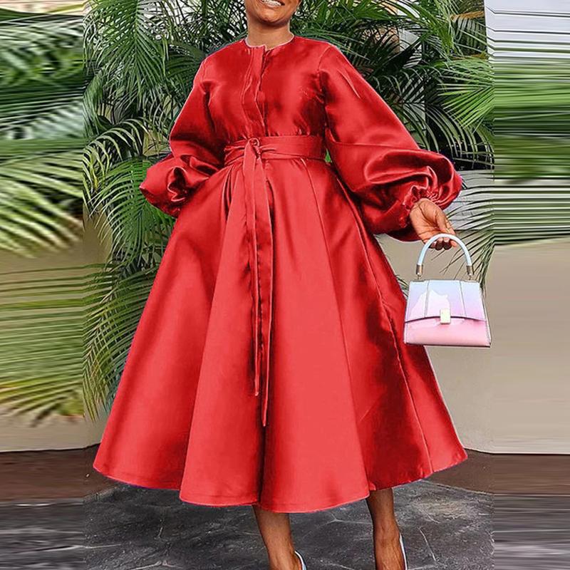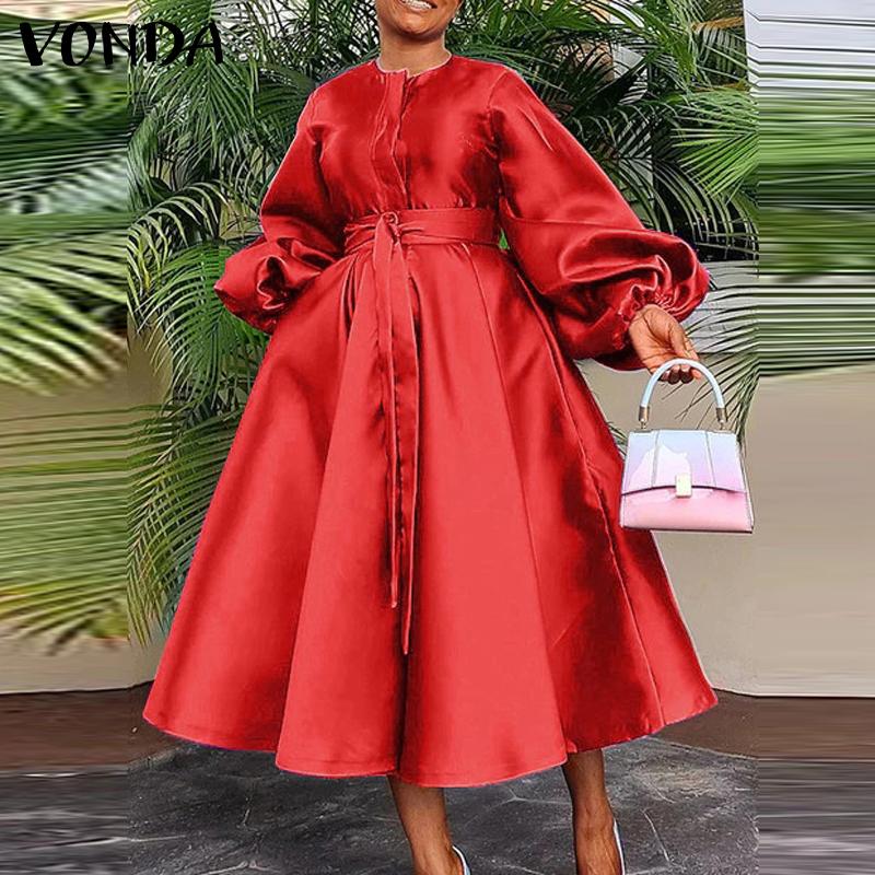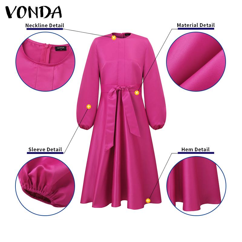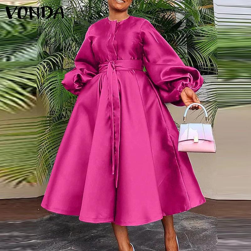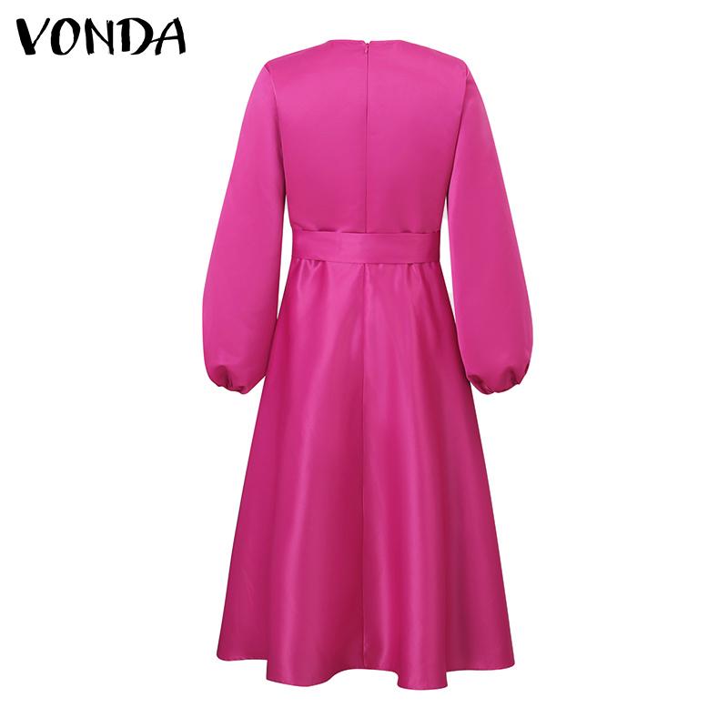 VONDA Женские большие размеры с круглым вырезом и длинным рукавом с поясом и карманами, свадебные атласные однотонные платья миди