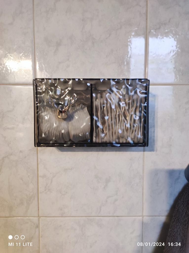 Держатель выглядит очень приятно, удобно хранить ватные диски и ватные палочки: они легко вынимаются, когда передняя панель как бы вываливается вперёд. Это удобнее и, возможно, компактнее, чем все эти круглые баночки с крышками
