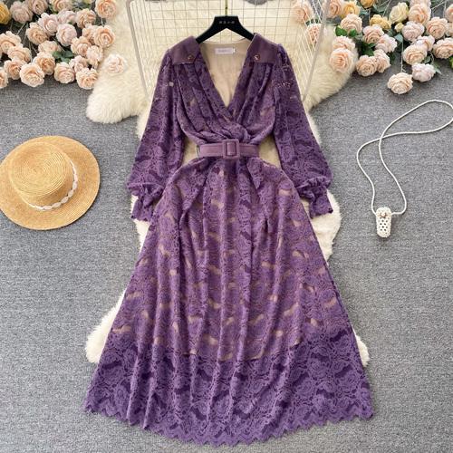Новые женские фиолетовые кружевные рождественские вечерние платья с v-образным вырезом, винтажное платье до середины икры с длинным рукавом и поясом