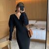 Элегантное длинное белое вязаное платье женское зимнее облегающее платье с v-образным вырезом и длинными рукавами в Корейском стиле офисное женское винтажное платье с высокой талией