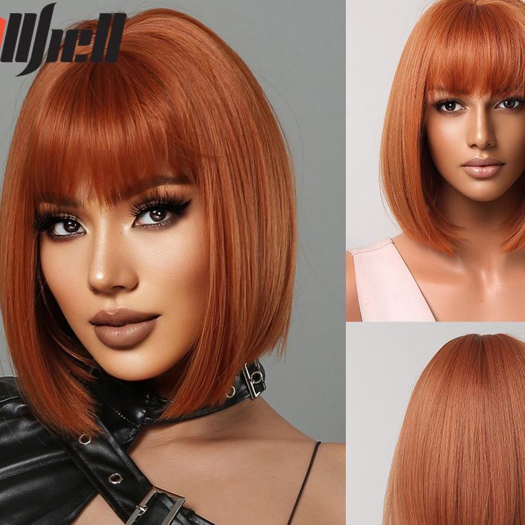 Короткие прямые синтетические парики Рыже-коричневый парик Боб с челкой для женщин Косплей Ежедневный парик из натуральных волос Термостойкое волокно
