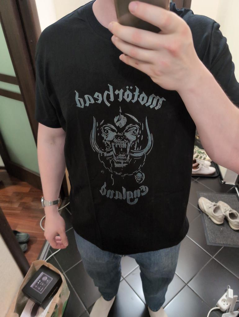 Абсолютно не соответствует фото в карточке — футболка полностью черная, хотя на фото серая а-ля garment dyed, а также в действительности принт вообще какого-то сомнительного качества и цвета, буквально серобуромалинового, не говоря уже о том, что он и другого размера относительно футболки!