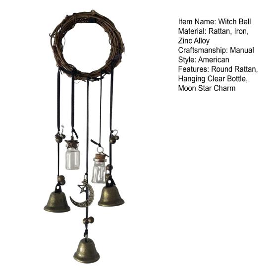 Колокольчик ведьмы ручной работы изготовлен из высококачественного металла, веревки, шпагата и ротанга, что обеспечивает долговечность и хорошее качество изготовления.