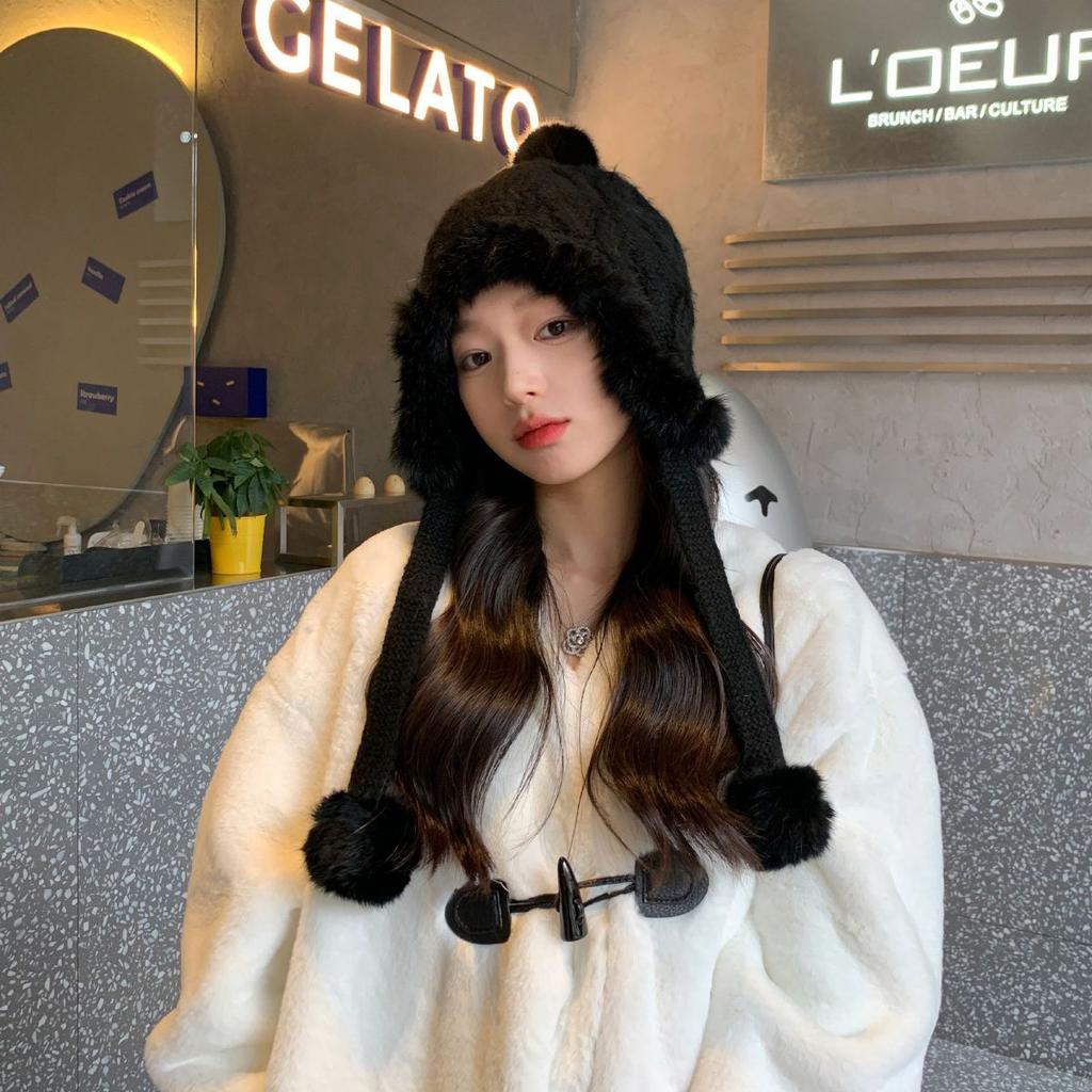 Плюшевая шапка для защиты ушей Корейская версия Женская зимняя теплая трендовая вязаная шапка из шерсти дикого кролика Холодостойкая вязаная шапка Повседневная уличная шапка с комком волос