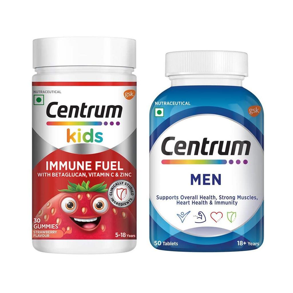 Набор: жевательные конфеты для детского иммунитета и добавка для мужчин (30 шт + 50 таб), Kids Immune Fuel Gummies & Men Set, Centrum