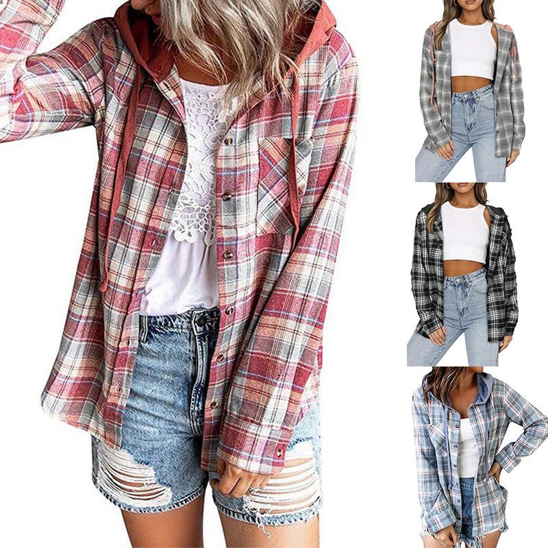 Весенне-осенняя женская рубашка, модная повседневная рубашка в клетку с капюшоном и цветными блоками — купить товар онлайн с бесплатной доставкой по всему миру!