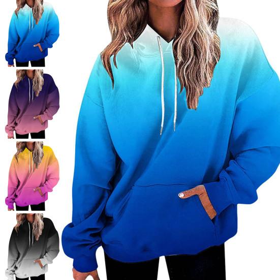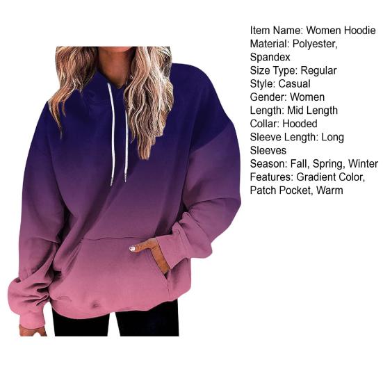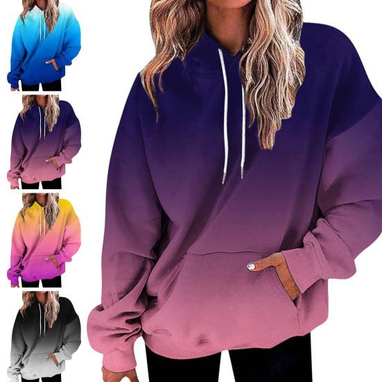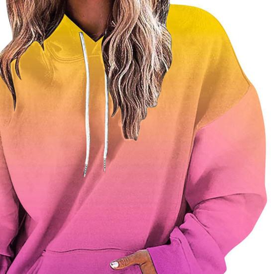 Представляем наш женский свитшот с градиентным принтом, идеальное дополнение к вашему осеннему и зимнему гардеробу.. Эта толстовка, изготовленная из смеси полиэстера и спандекса, невероятно мягкая и удобная, согревает в холодные месяцы.. Классический крой прекрасно подчеркивает вашу фигуру, а длинные рукава и капюшон обеспечивают дополнительное тепло и стиль.. Этот пуловер с градиентным принтом и непринужденной посадкой одновременно моден и универсален.. Имеет удобные карманы для дополнительной функциональности.. Сочетайте его с джинсами или леггинсами, чтобы создать стильный образ, который можно носить в различных случаях, например, в офисе, в школе, на званых обедах, на свежем воздухе или даже просто отдыхая дома.. Модель с капюшоном позволяет легко надевать и снимать пуловер.. Не упустите эту незаменимую толстовку, которая легко сочетает в себе моду и комфорт.