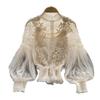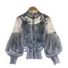 Представляем нашу женскую цветочную рубашку, идеальное сочетание моды и элегантности. Эта однотонная рубашка украшена трехмерными цветами и прозрачным сетчатым дизайном, что добавляет нотку изысканности вашему образу. Рукава фонаря еще больше подчеркивают его стильную привлекательность.