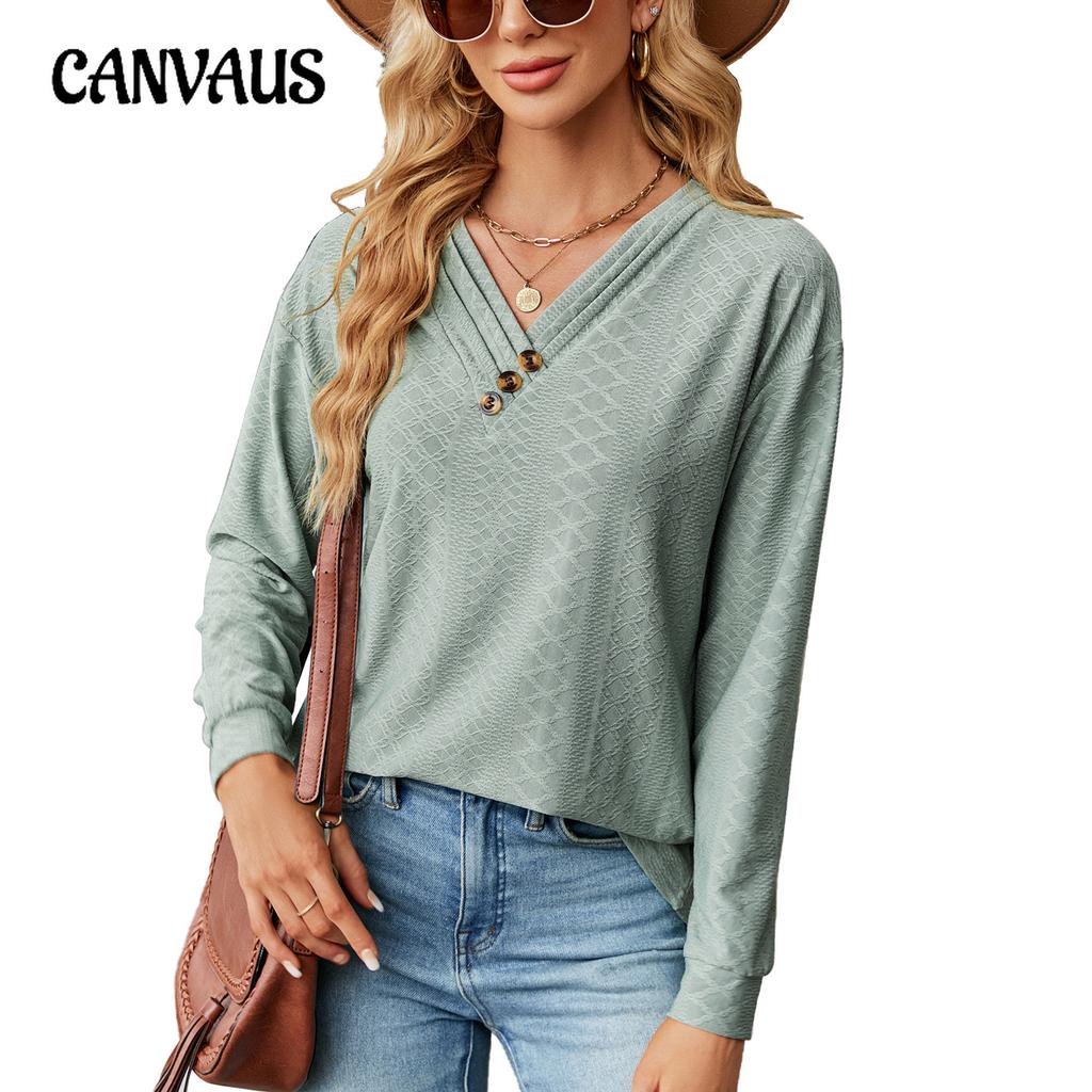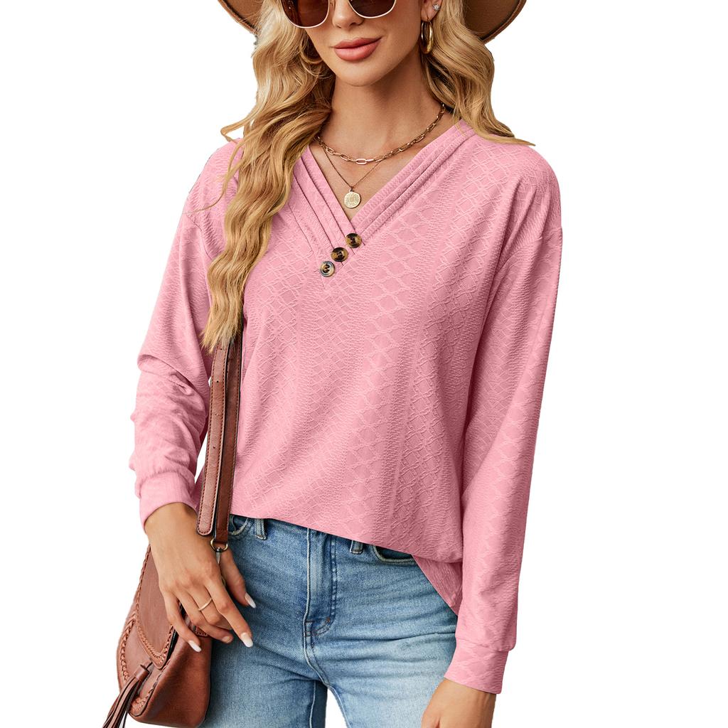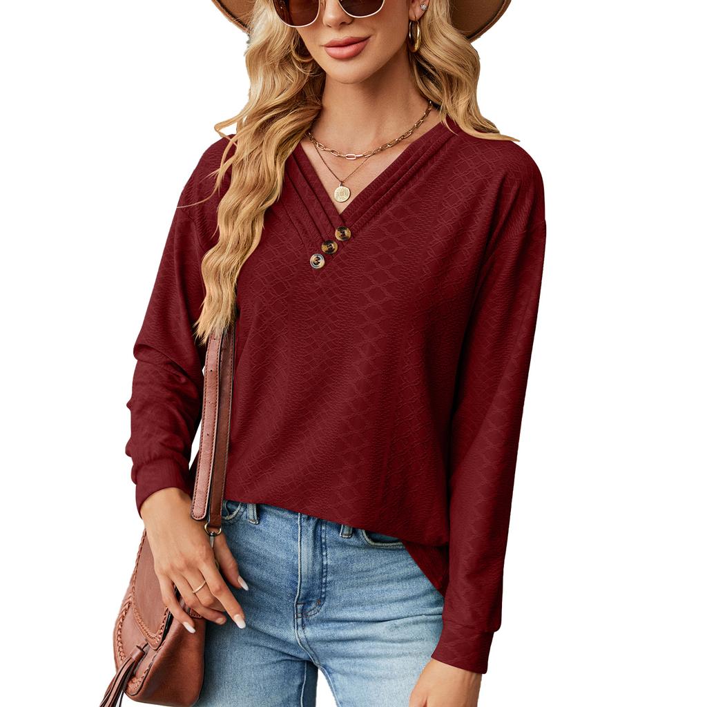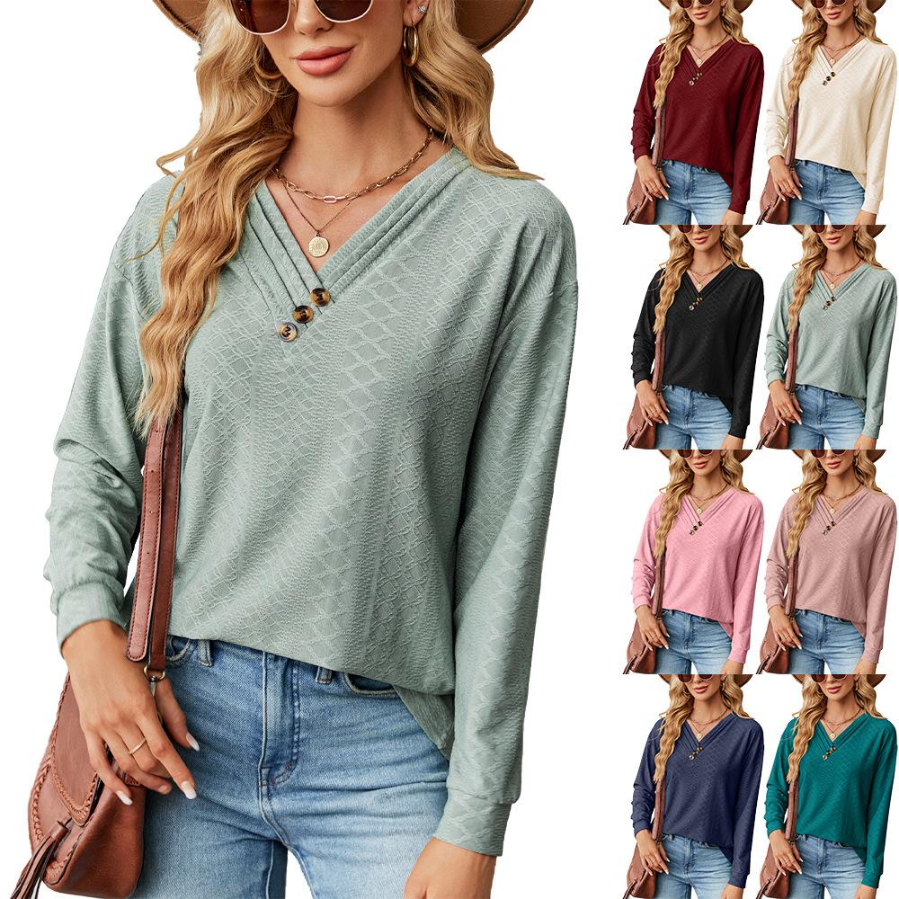 Весенне-осенняя женская блузка, однотонный свободный топ с длинными рукавами на пуговицах и v-образным вырезом