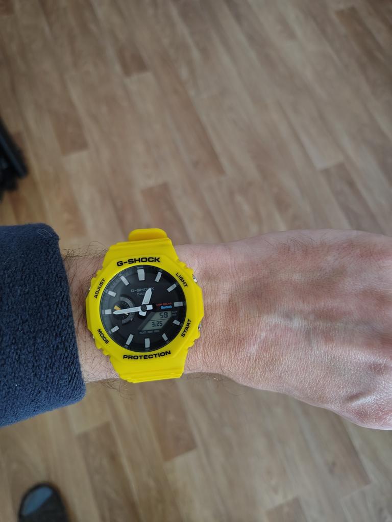 Мои первые пластиковые часы. С 17 лет хожу в швейцарских. Стало интересно попробовать G Shock и попалась эта модель. Привлек дизайн, люблю яркие сочетания. Пришли полностью разряженные. Зарядились на окне за 5 дней (3 дня солнечные, 2 переменно) Корпус - Китай, механизм - Япония. С телефоном соединились, но ПО не смог обновить, пока не зарядились на максимум. Ощущение неоднозначное. С одной стороны хорошие характеристики по защите, лёгкие, цвет. С другой пластик даже в метках на циферблате очень непривычно для взрослых часов. Хотя сам пластик лучше, чем на некоторых швейцарцах😉 Не хватает хорошего люма на стрелках и метках. Это бы добавило ощущение от часов. У меня небольшая коллекция, есть с чем сравнивать тактильно. На руку 18,5 в охвате нормально, но лучше на руку потоньше, если использовать родной браслет. Слишком резко уходит вниз на ушках и часы над рукой, если не сильно затягивать. Покажу на фото.