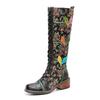 Johnature Высокие сапоги из натуральной кожи. Женская обувь. Сапоги до середины икры ручной работы с принтом в стиле ретро на шнуровке.