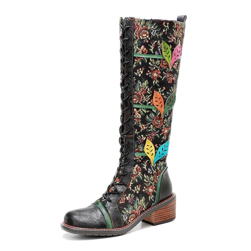 Johnature Высокие сапоги из натуральной кожи. Женская обувь. Сапоги до середины икры ручной работы с принтом в стиле ретро на шнуровке. — купить товар онлайн с бесплатной доставкой по всему миру!