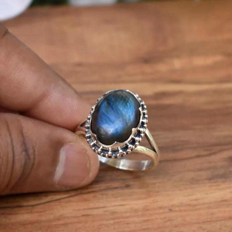 Дизайнерское кольцо ручной работы в стиле бохо с лабрадоритом и овальным драгоценным камнем, серебряное кольцо 925 пробы, кольцо с камнем, эффектные ювелирные изделия