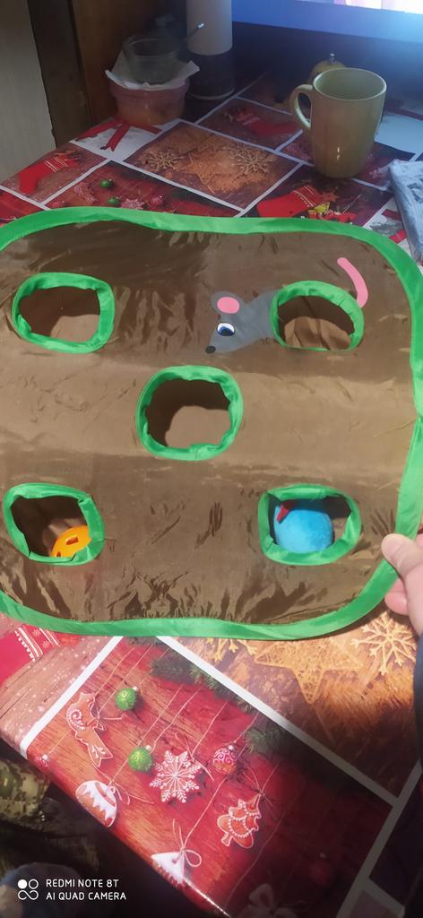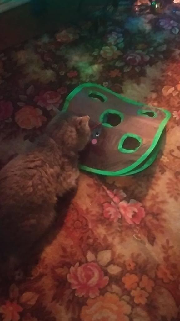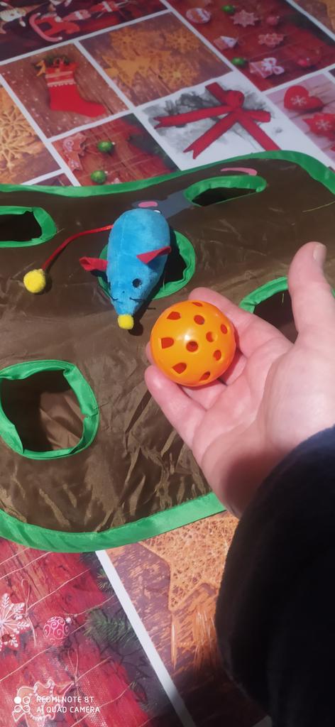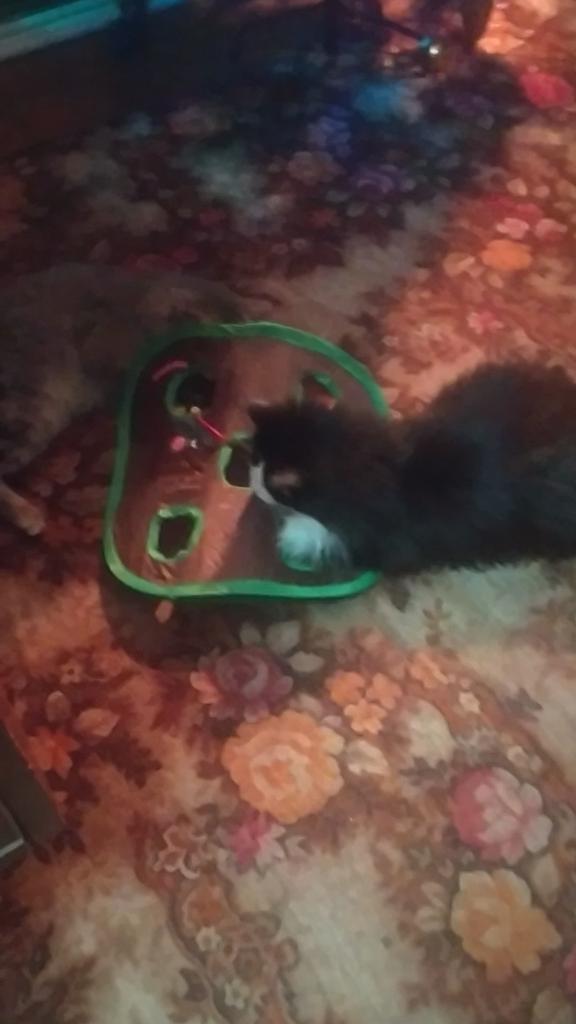 Выиграла игру для кошек за 1 рубль. Заплатила одним баллом. Выбирать было особо нечего, нажала на эту штуку и выиграла неожиданно именно её. Пришла на удивление быстро, недели за две. Размерами небольшая. Сшита крепко, надёжно. Из материала как для зонтов. Для формы вставлены пружинистые ободки. Присутствует мышь, бархатная и набитая мягким. Даже усы у мышки смастерили. Далее в комплекте пластмассовый шарик-погремушка. Достаточно крупный. На фото показала, смотрим. Все три наших кота прибалдели от этой игрушки. Чем-то пропитали или ещё что, но коты балдеют именно от запаха, который чуют только они. Скорее всего в игре где то присутствует котовник. Может в игрушках или в самой ткани. Через пару дней два взрослых кота уже не сильно реагируют на эту игру, а молодой кошак поигрывает периодически, ну он сам по себе игривый. Выигрывать всегда приятно и всем вам приятностей и выигрышей.