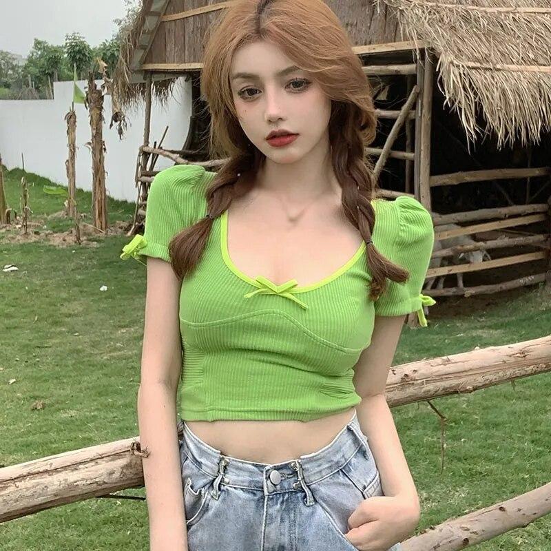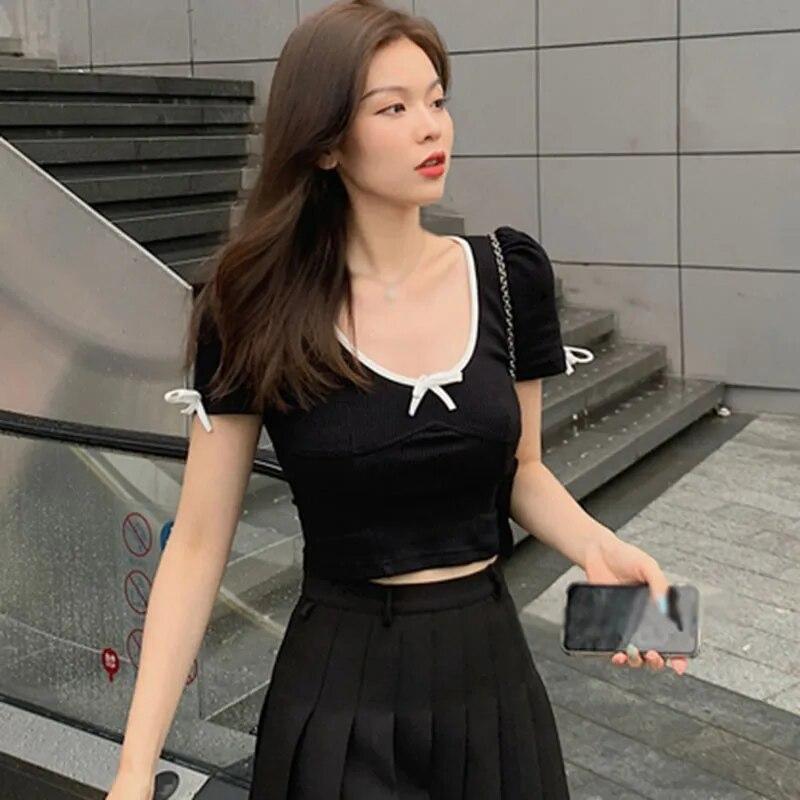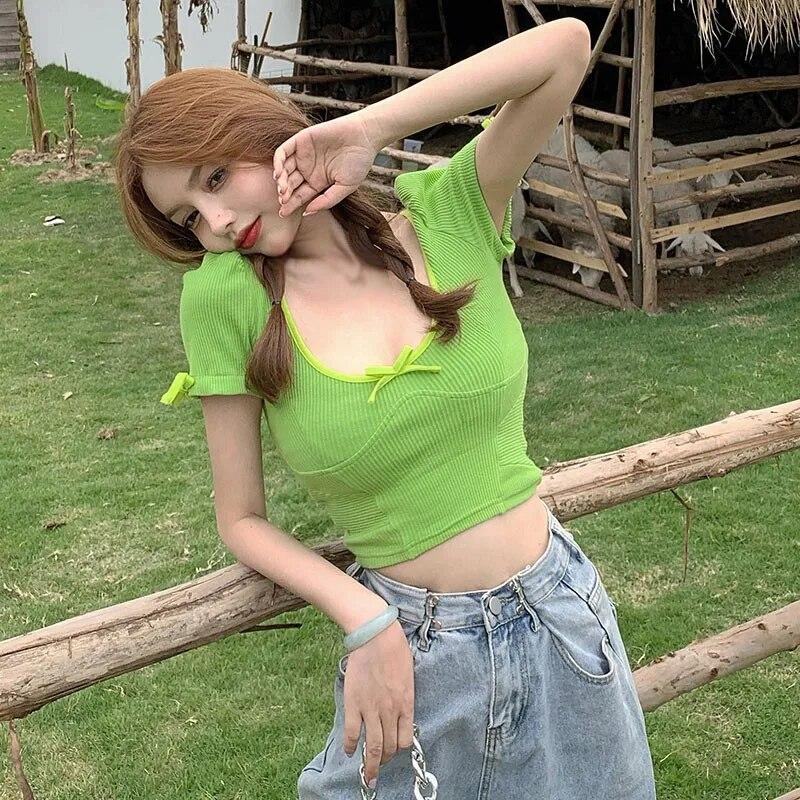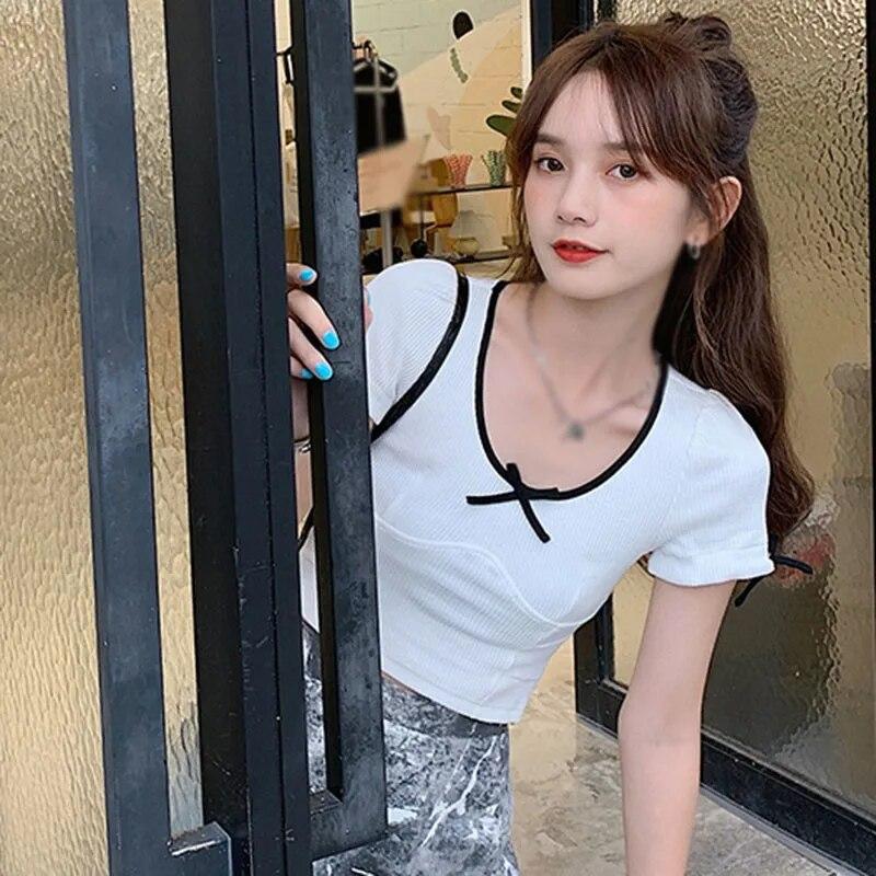 Женские трикотажные футболки с короткими рукавами и контрастным тонким пупком с круглым вырезом, женские топы