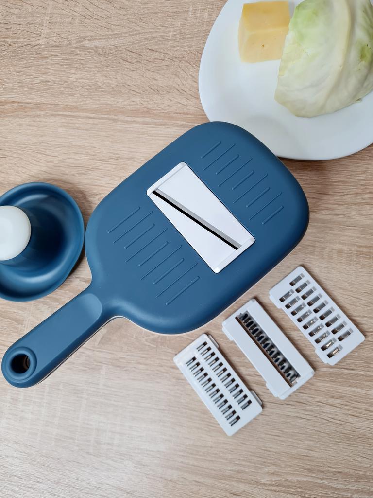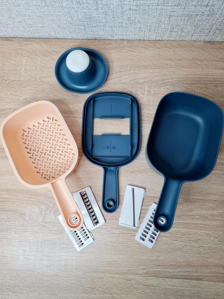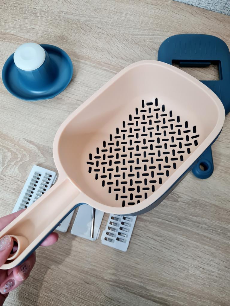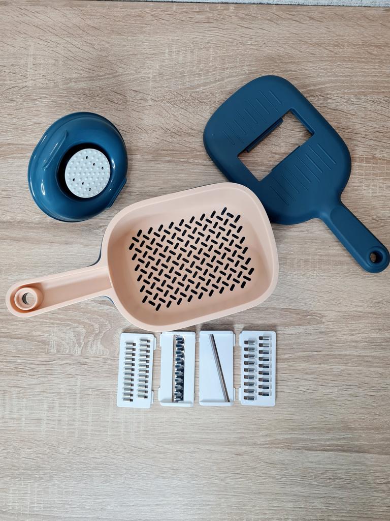 Функциональная терка (овощерезка) на кухню. 🤩🤩🤩 Отличная вещь на кухне, которая поможет приготовить разнообразные блюда или салаты и упростить процесс готовки. Довольно удобно нарезать и измельчать овощи и фрукты. В комплекте имеются 4 насадки, которые позволяют нарезать овощи и фрукты в различные формы - соломка, чипсы и другое, это делает процесс приготовления пищи более разнообразным и интересным. Тёрка состоит из ёмкости, дуршлага для промывания нарезанных овощей и фруктов и крышки, а также в комплект входит 4 насадки. Тёрка сделана из крепкого пластика, ножи у насадок сделаны из стали и очень острые. Покупкой очень доволен. Продавцу большое спасибо за качественный товар! Заказ получил в отделении почты в идеальном состоянии Приятных покупок! 😊👍