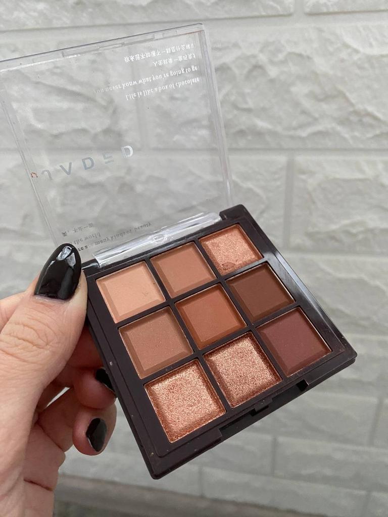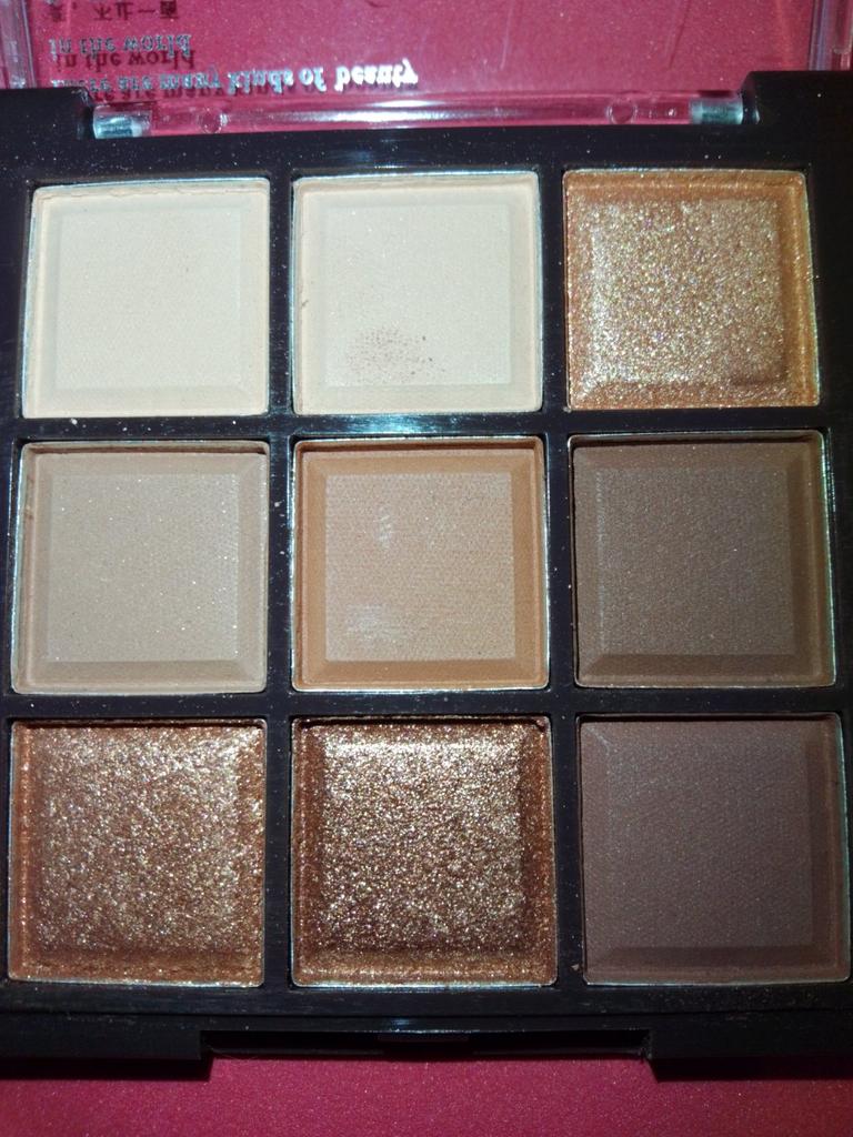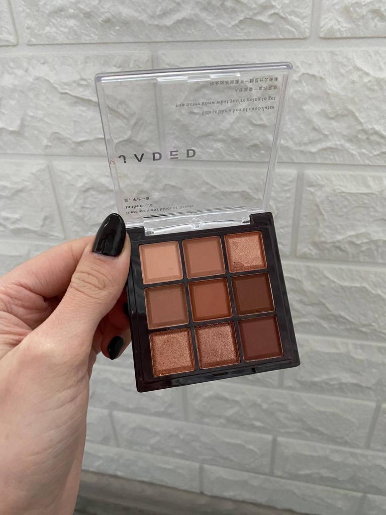 Тени для век. Идеально подобрано 9 коричневых оттенков. Из них 3 шиммерных,1 слабо шимерный,и 5 матовых. Все оттенки сочетаются между собой. Подойдут как для дневного макияжа так и вечернего. Пигментация отличная. Ложатся хорошо, растушевываются. Держатся целый день, не осыпаются. Палетка супер. Качественная упаковка Доступная цена. Доставка. заняла 3 недели. Палетка понравилась, рекомендую.