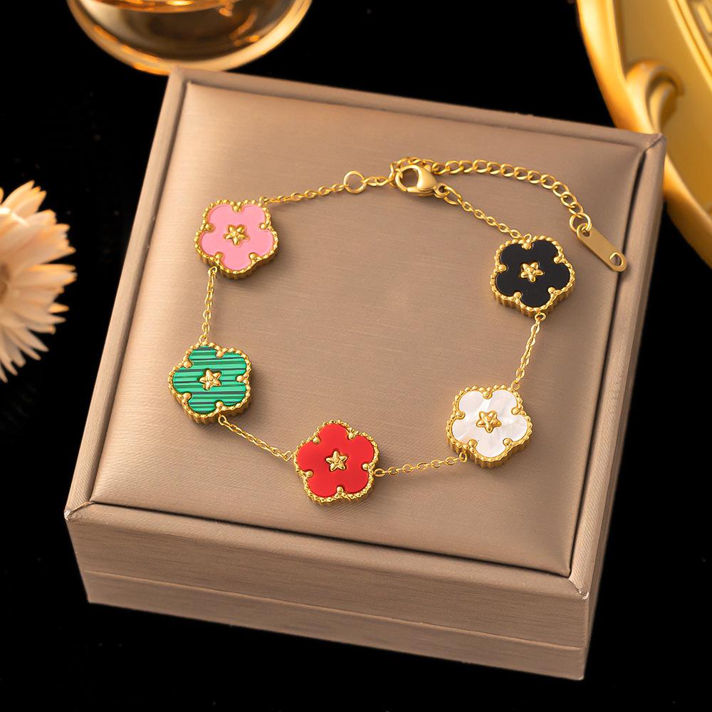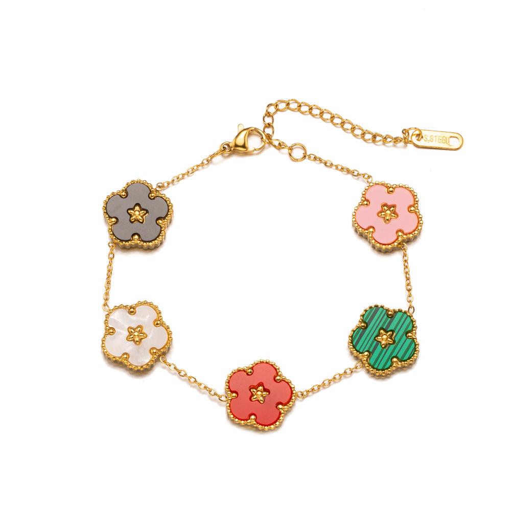 Браслет из титановой стали с пятью листьями травы и сливы. Двусторонний браслет Fritillaria с несколькими цветами. Маленький свежий и элегантный женский браслет.
