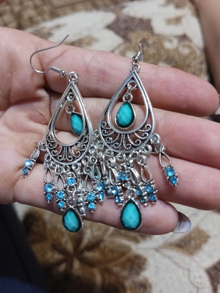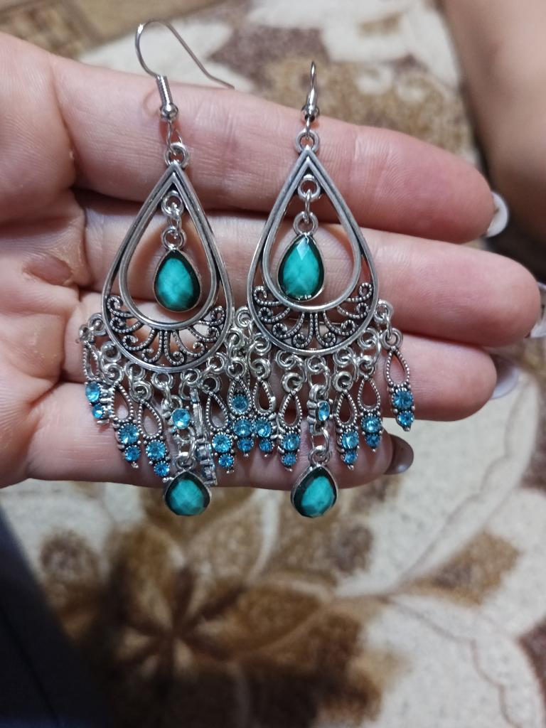 Очень неаккуратная работа: у одной серьги у внутренней висюльки длинеая поддержка и она не имеет возможности раскачиваться... на другой криво приклеены камушки... Да и по цвету фу!....большие - бирюзовые, а мелкие - голубые...