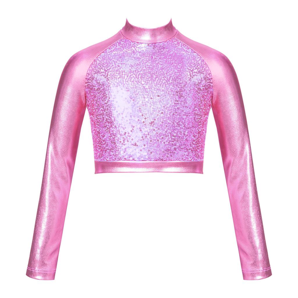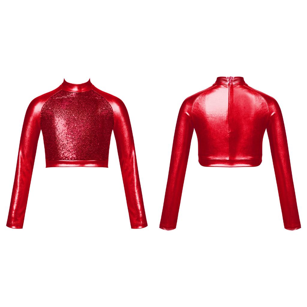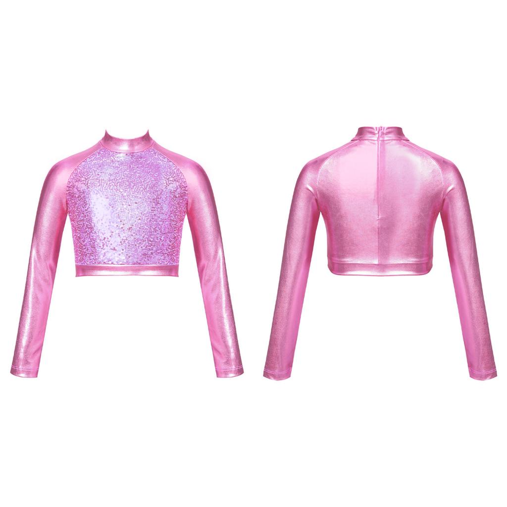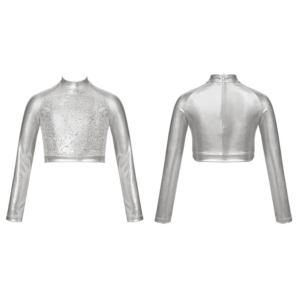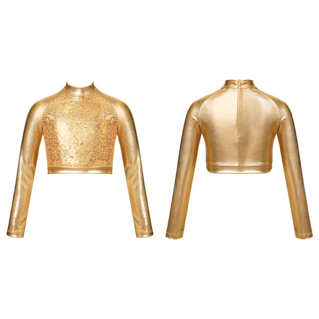 Детский блестящий укороченный топ с высоким воротом для девочек, металлическая футболка с длинными рукавами, купальник для балета, танцев, гимнастики, выступления