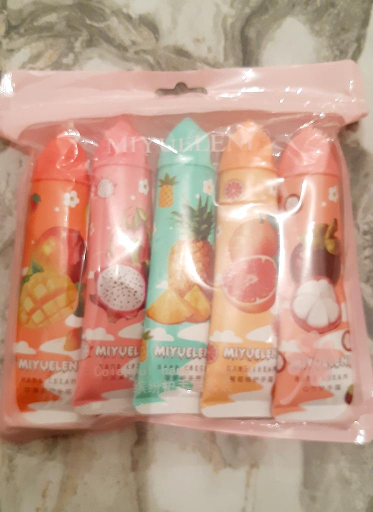 🟡🟢🟠🔴 крем для рук 🔵🟣⚪🟤 Хорошо оформлены наборы по 5 кремов👍 🍍🍊🥭 ненавязчивые, приятные, фруктовые запахи 👌 💫текстура приятная, впитываются быстро, кожа после использования шелковистая, мягкая, нежная..👍 🌈 тюбики запечатаны алюминиевой фольгой👍 💥удобно брать с собой в дорогу, хороши для презентов🙂 😊 моим девочкам - подросткам понравились 💕 🤍 спасибо продавцу и joom🌹
