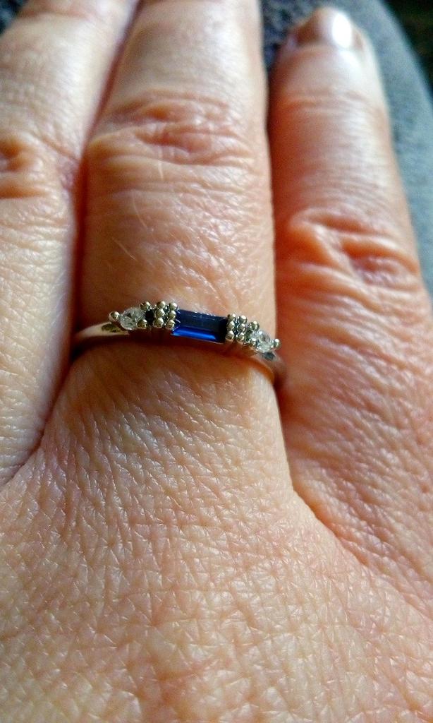 Колечко премиленькое, миниатюрное. Камушек насыщенно-синий, похож на сапфир. Колечко не плоское, камешки возвышаются над пальцем, как корона. За счет этого может цепляться за одежду. Размер 6 соответствует нашему 16,5.
