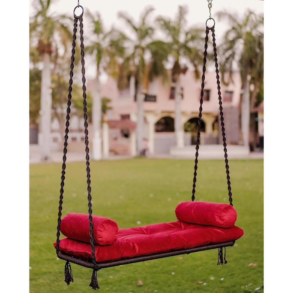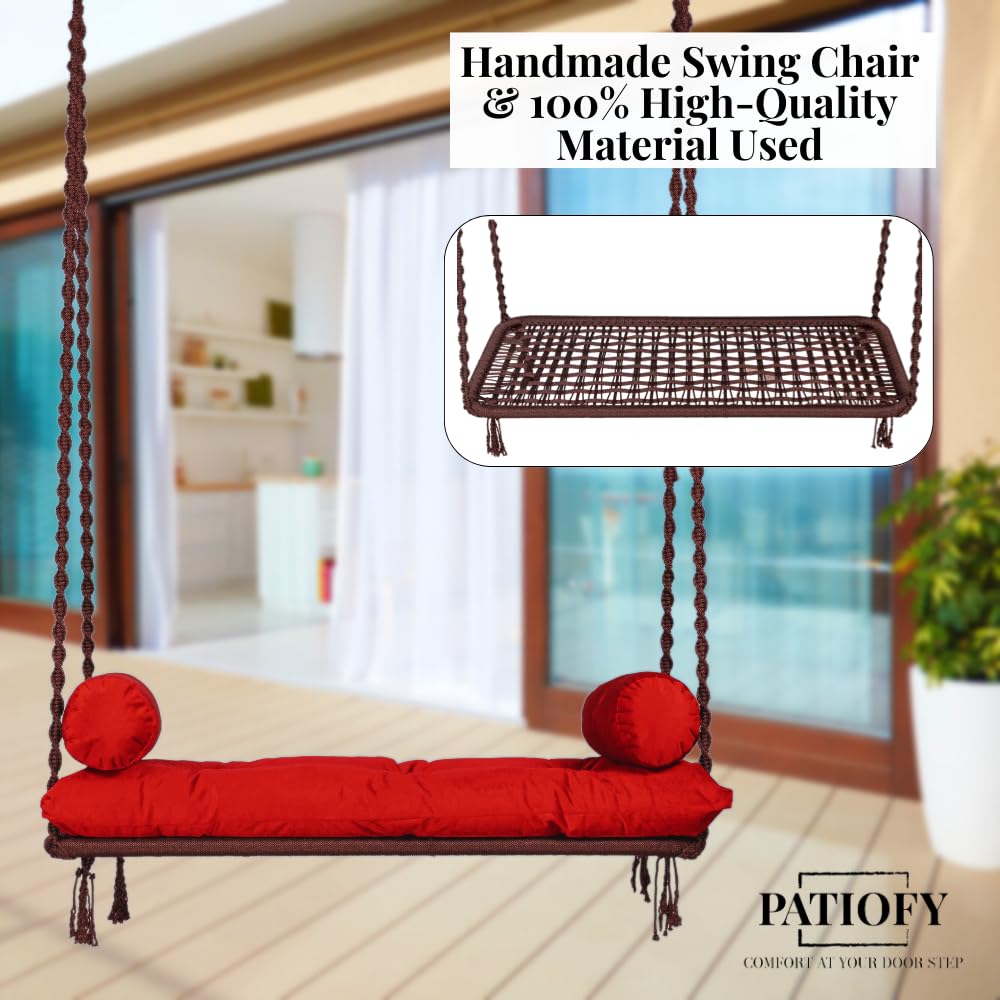 Качели для взрослых / Джула для взрослых / 2-местные качели премиум-класса для взрослых / Кресло-качели / Подвесные качели в гамаке для балкона / Качели для гостиной с красной подушкой для сидения и комплектом для подвешивания - коричневый