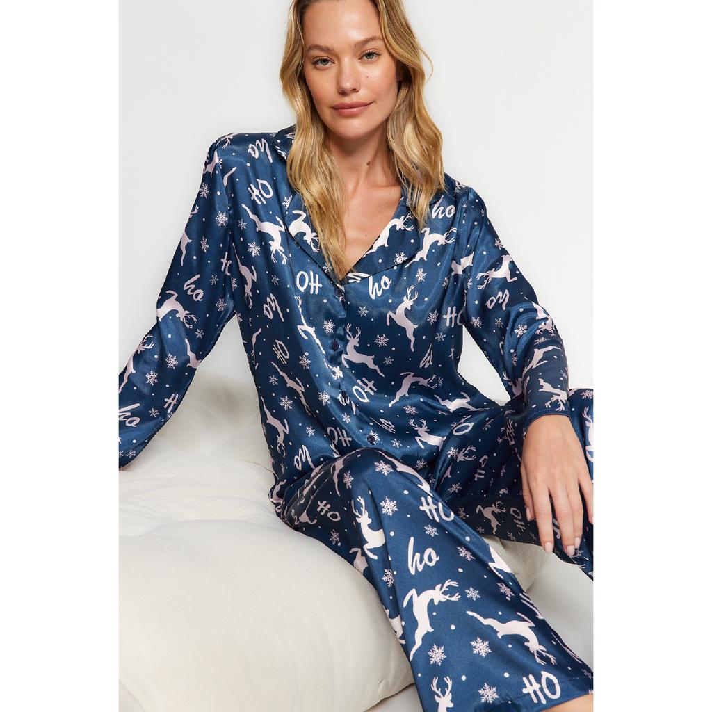 Темно-сине-разноцветный атласный пижамный комплект с новогодней тематикой Thmaw24pt00037 — купить товар онлайн с бесплатной доставкой до всему миру!