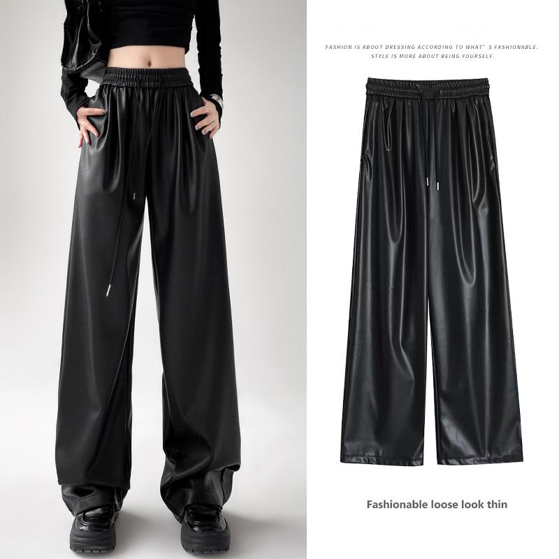 Черные широкие брюки из искусственной кожи, женские осенние винтажные эластичные брюки с высокой талией Y2K, мешковатые прямые брюки в стиле Харадзюку
