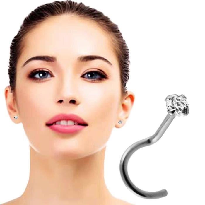Украшение для пирсинга носа из цельного белого золота 14 карат, украшенное круглым фианитом диаметром 2,5 мм, прошитым четырьмя зубцами.