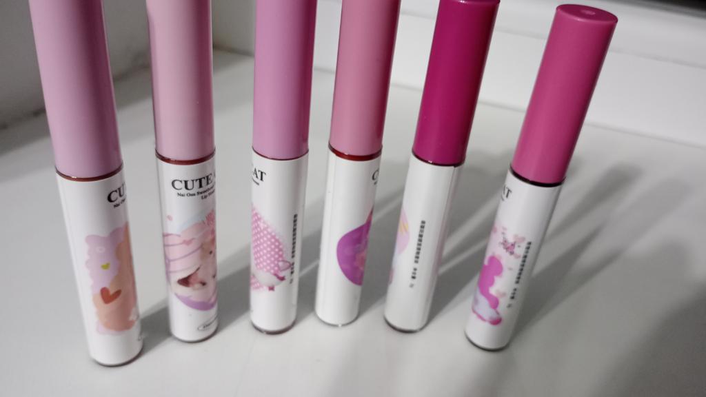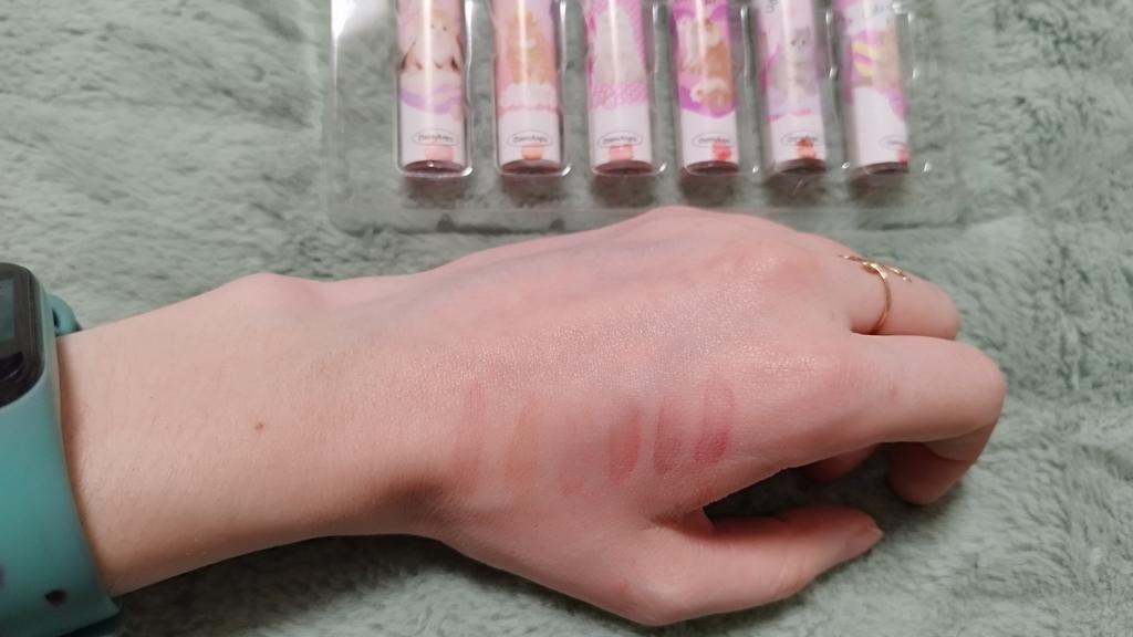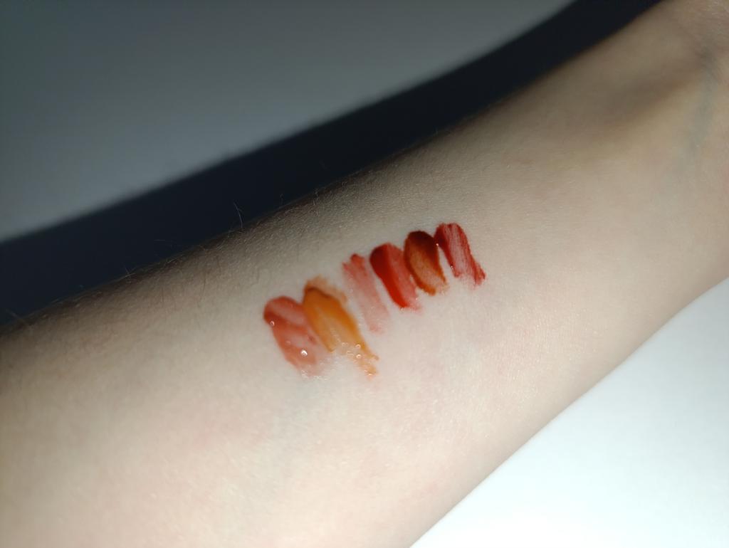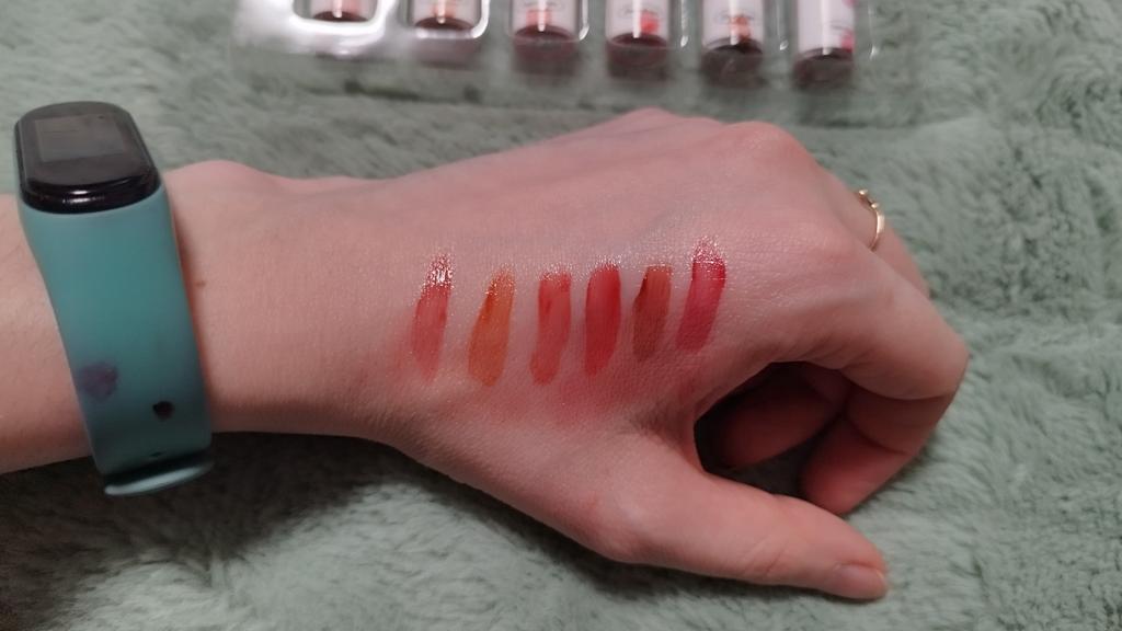 Набор из 6 тинт-блесков: два светлых оттенка, ярко-красный, оранжевый, два относительно темных. Перед использованием я наношу гигиеничку, потому что без неё губы выглядят сухо и слишком ярко(лично для меня). В жизни оттенки выглядят лучше чем на фото, на втором фото это я стёрла их буквально спустя пару секунд после нанесения, но цвета остались. Упаковка коробки и каждой помадки супер милая! На последней фотке я нанесла гигиеничку, карандаш, и 2-3 тинта. Каждый блеск пахнет апельсинками!