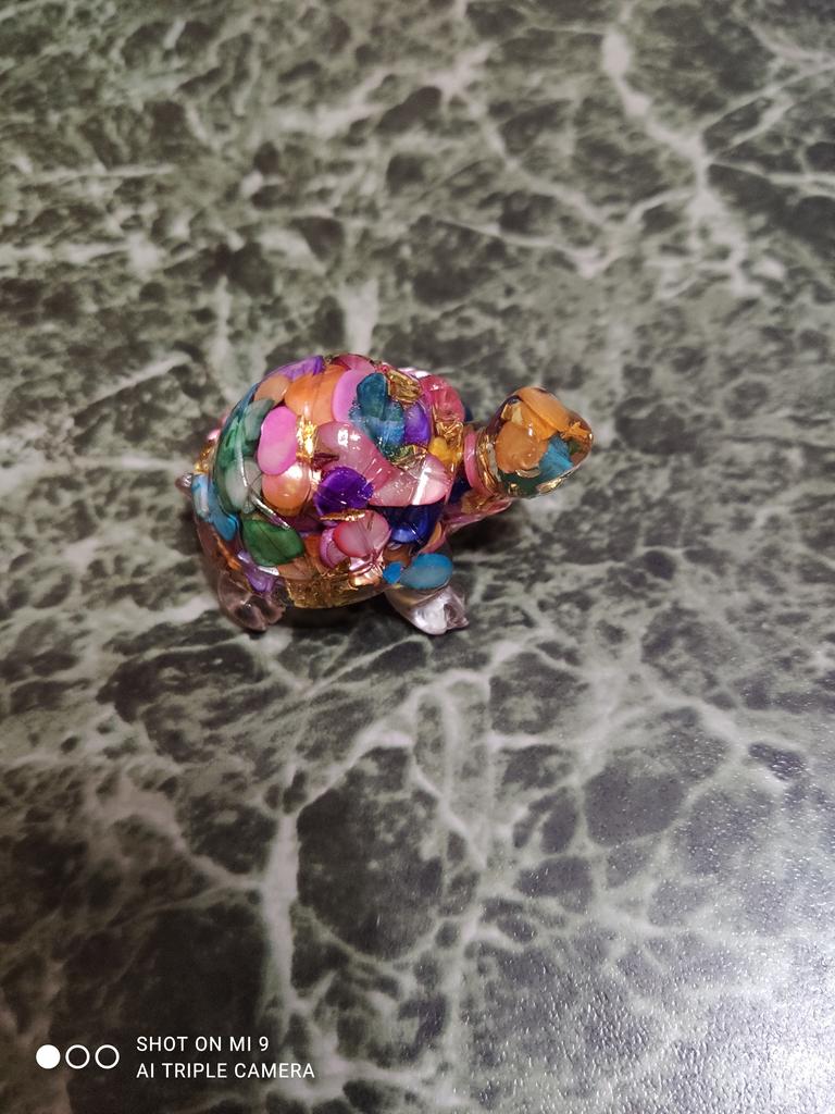 Черепашка красивая, яркая, но поверхность у статуэтки матовая, блеклая. Я сама покрасила её бесцветным лаком. Она просто засияла.