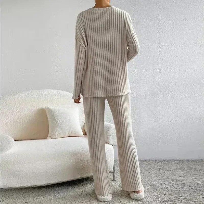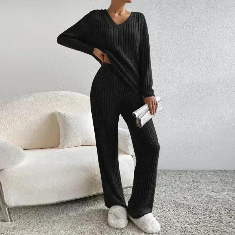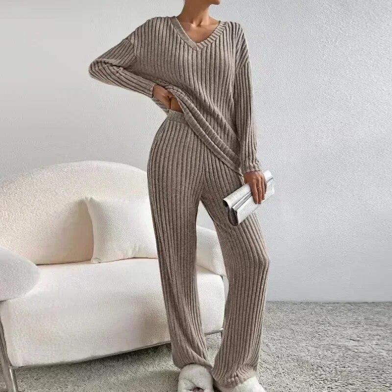 Осенняя блузка с длинным рукавом и брюками с v-образным вырезом, женские винтажные прямые брюки, вязаный пуловер в полоску, комплекты из двух предметов, наряды 29772