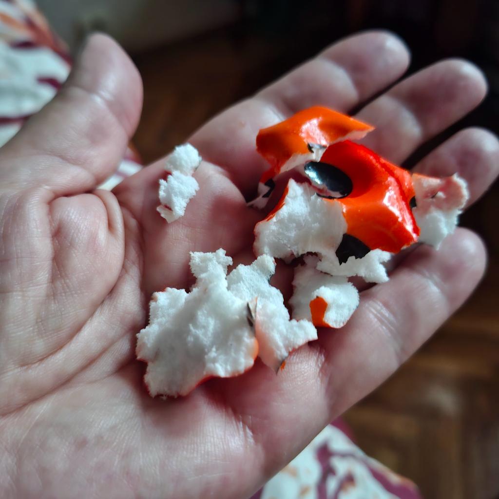 Покупался вообще то для игры собачке. Я думала он резиновый...А он поролоновый. А сверху покрашен. Собачка в первую минуту его разодрала....Как не наглоталась этого поролона...Короче для собак не рекомендую. Да и ребёнок если разгрызет и наглотается...