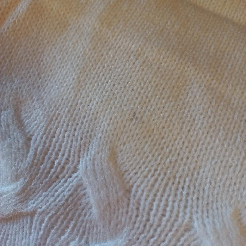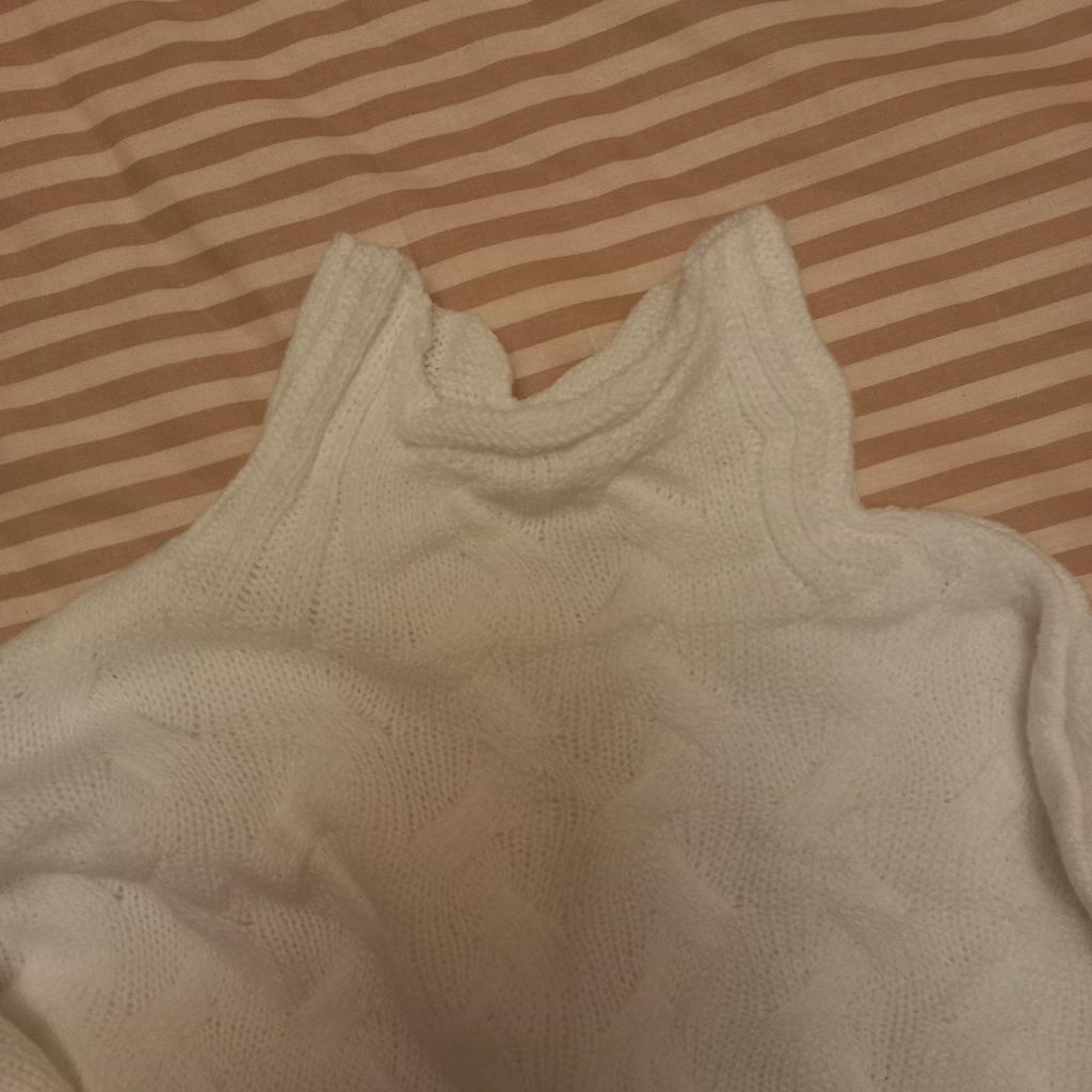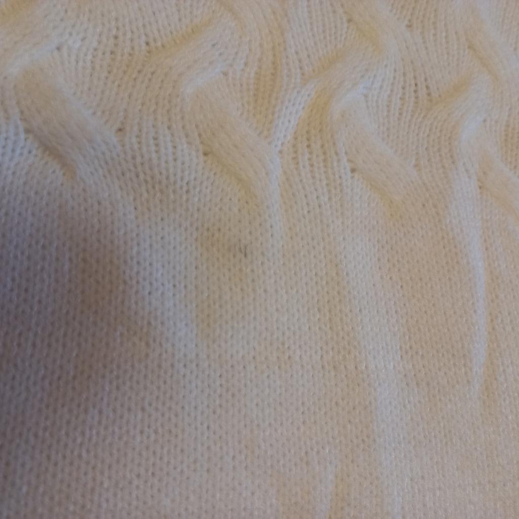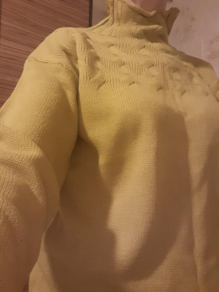 Белоснежный свитр. (Периодически заказываешь белую вещь, а приходит молочная, айвори или что-то приближённое к белому, а этот свитр действительно белый). Тоненький. В принципе понравился, только воротник- стоечка какой-то частично скрученный, пока не могу с ним справиться. И - неприятность - маленькое тёмное пятнышко на груди.. С пятнышком справилась, ношу с удовольствием.