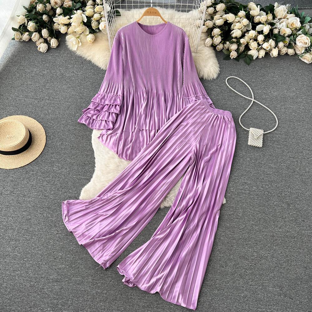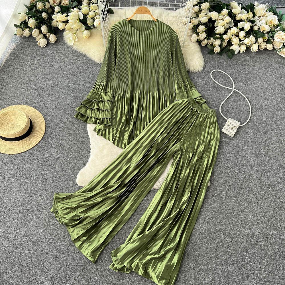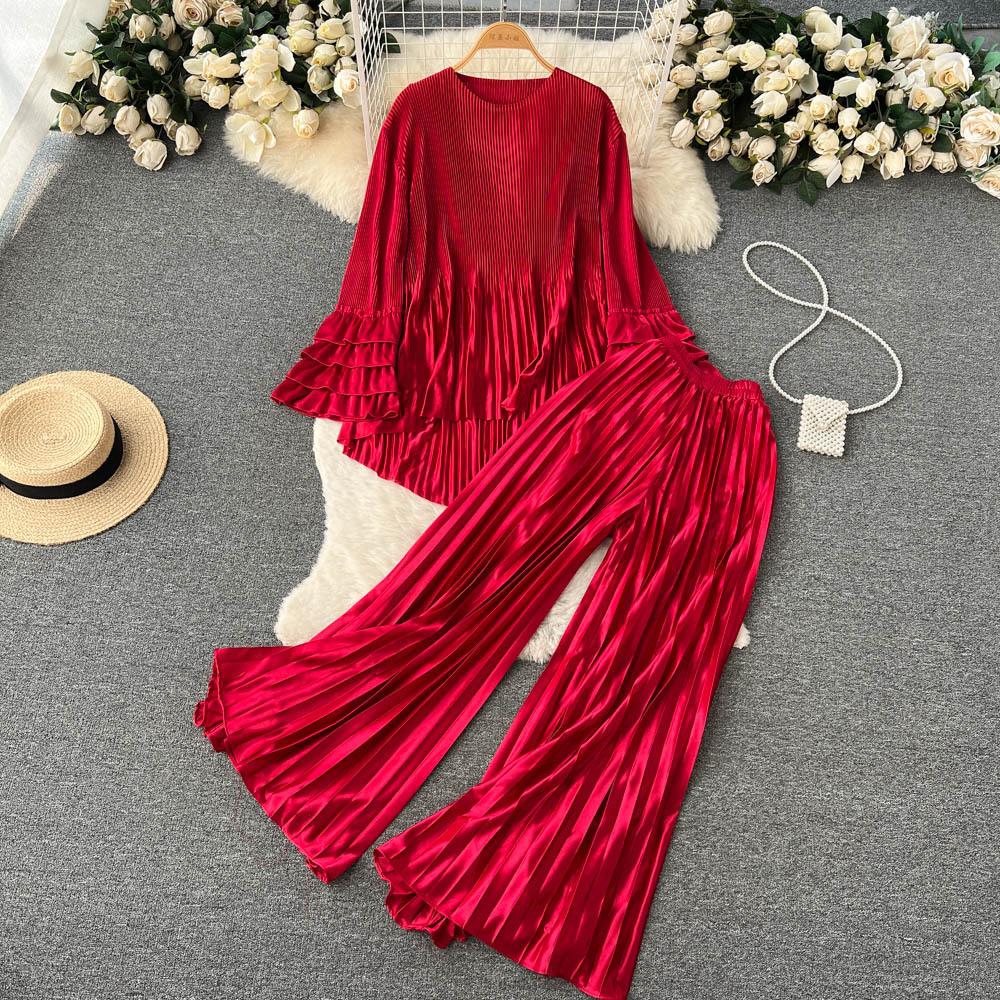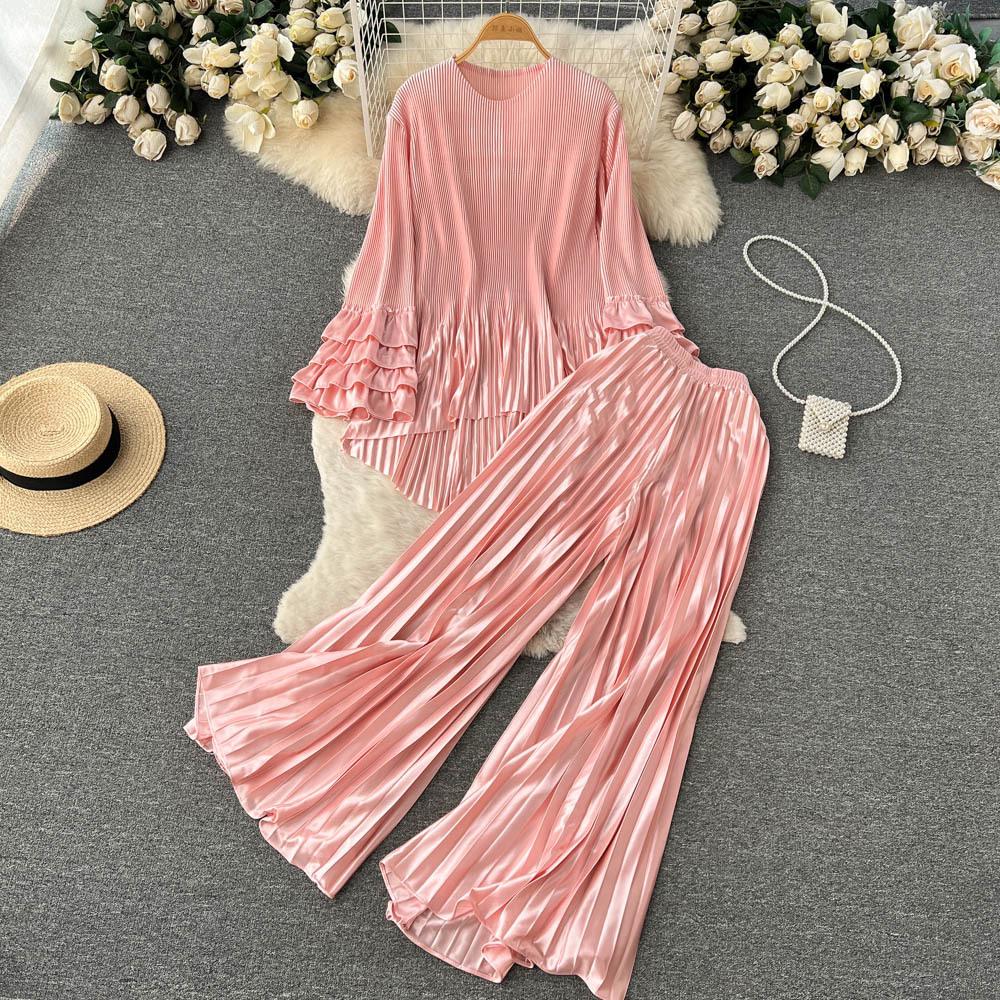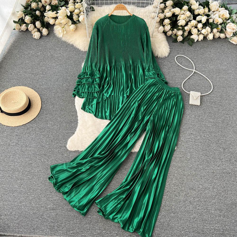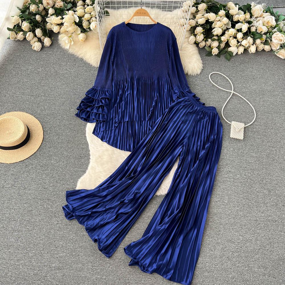 Весенне-осенний женский топ с длинными рукавами, комплект с широкими брюками, свободный топ с нерегулярными рукавами-пузырьками, плиссированные широкие брюки, комплект из двух предметов