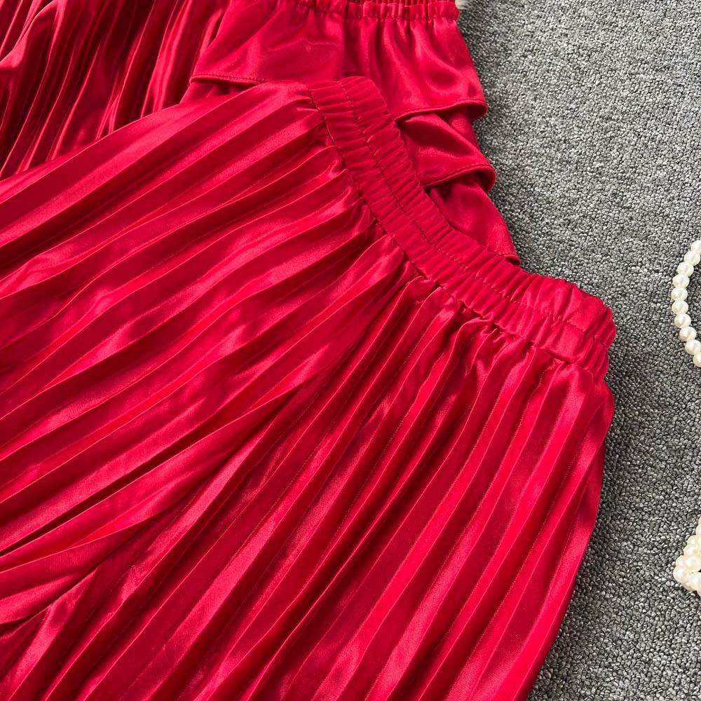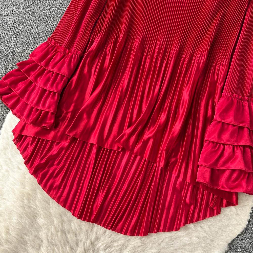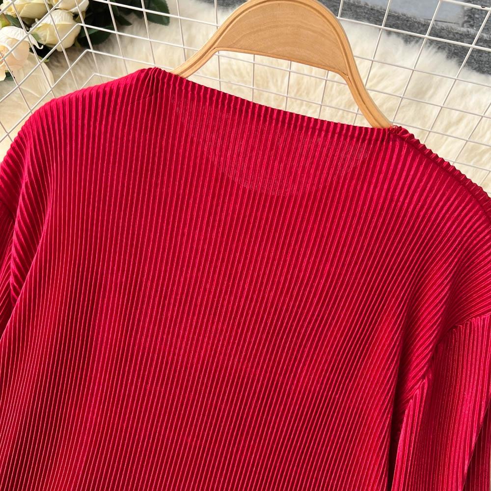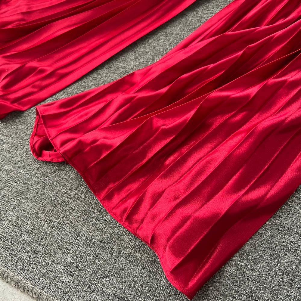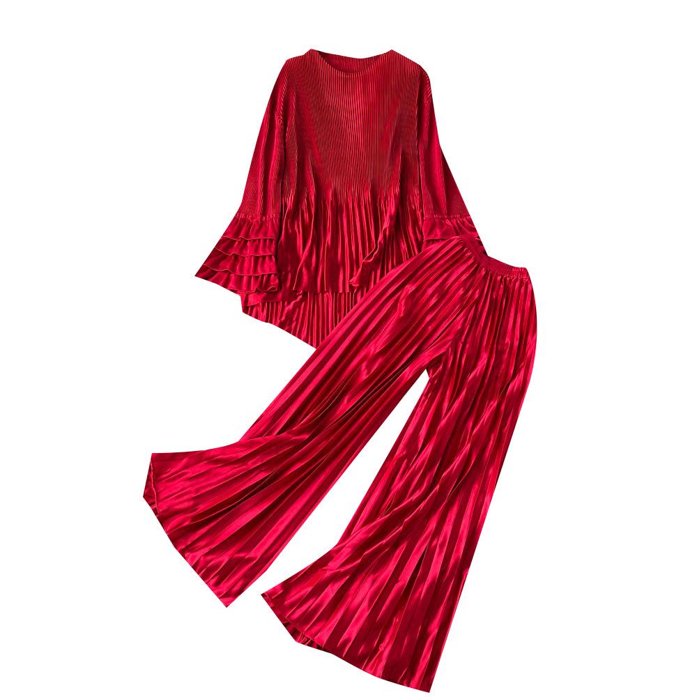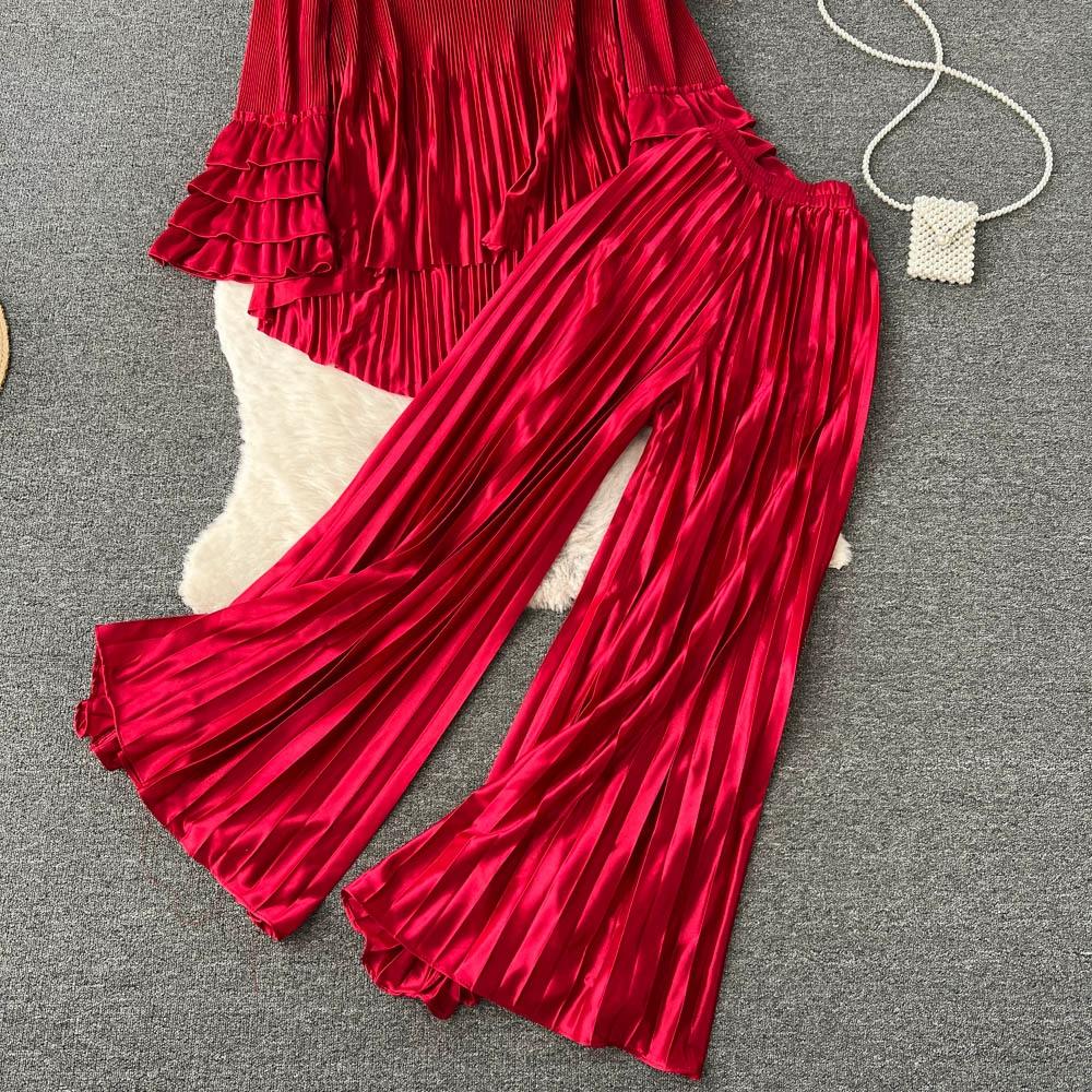 Весенне-осенний женский топ с длинными рукавами, комплект с широкими брюками, свободный топ с нерегулярными рукавами-пузырьками, плиссированные широкие брюки, комплект из двух предметов