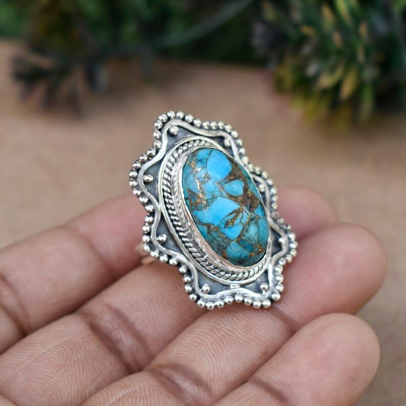 Кольцо с овальным драгоценным камнем из синей меди и бирюзы, серебряное кольцо 925 пробы, кольцо в стиле бохо, подарок для нее, эффектное кольцо, дизайнерское кольцо, женское кольцо
