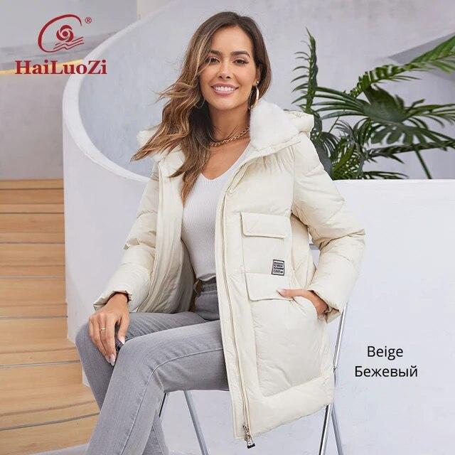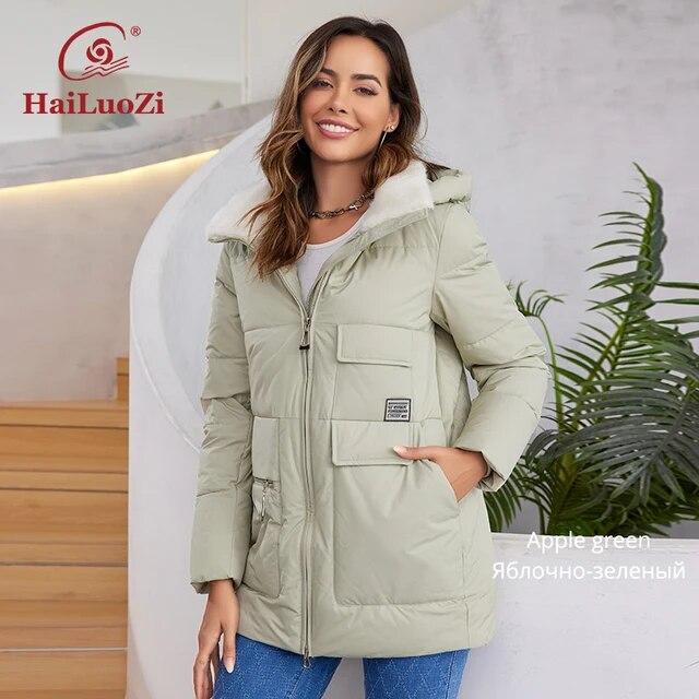 HaiLuoZi Новинка 2023 года, зимний пуховик, женский короткий классический дизайн с вырезом и мехом, женские парки на молнии с карманом, женское пальто 1112