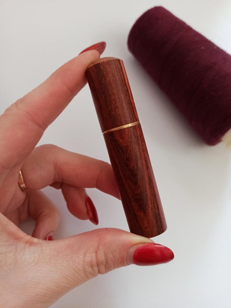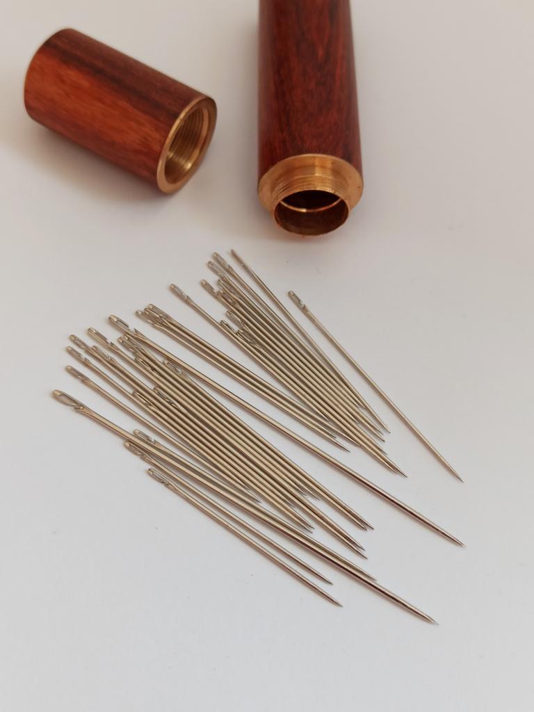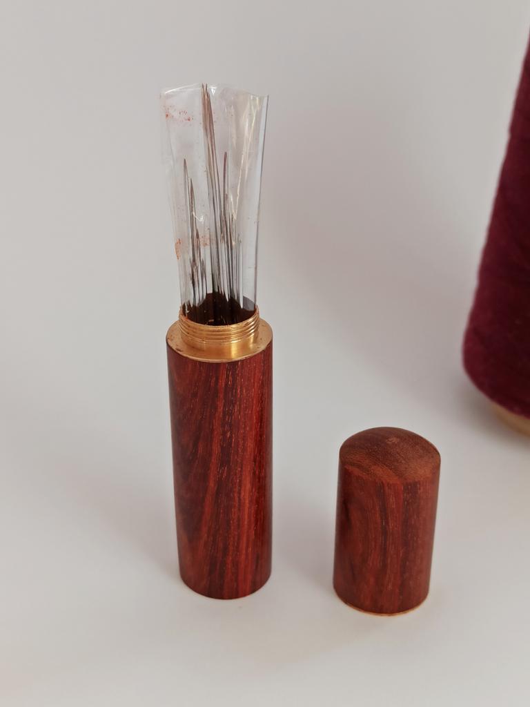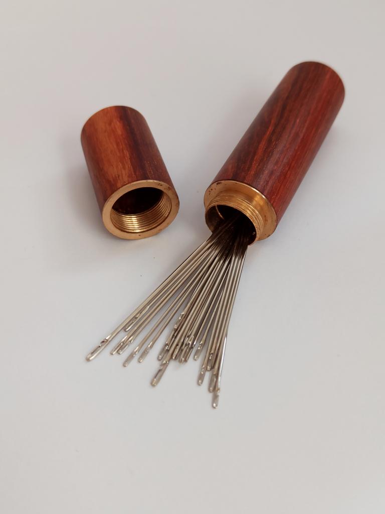 Вот что действительно понравилось, так это дизайн. Футляр выполнен довольно качественно и красиво. Иголки не пересчитывала, но наиболее длинных было 2 шт, и только они выглядывают из открытого футляра. С практической точки зрения такая система хранения очень неудобна в использовании: чтобы выбрать иглу нужной длины приходится каждый раз высыпать из футляра все иглы. (Для примера положила рядом менее симпатичную, но реально удобную систему хранения с возможностью вытряхнуть через отверстие на крутящемся круге конкретную иглу нужной длины.) Было бы удобнее, если б футляр раскручивался примерно посередине, на высоте несколько ниже самой короткой иглы, чтобы можно было выбрать и взять нужную, не вытряхивая остальные. Ну и кусочек паролона внутри в качестве игольницы не помешал бы: это позволит рассортировать их по длине. Игл с "золотым" ушком, кстати, в комплект не положили. Все иглы однотонные.